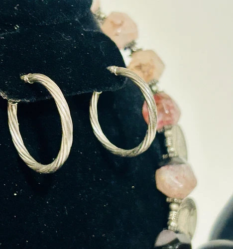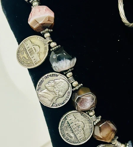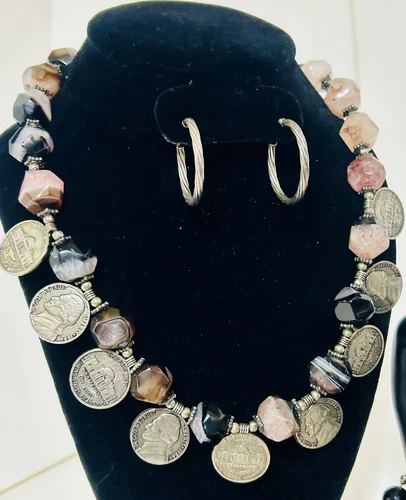 4 PIECES. An Eclectic mix of Sterling Silver, Quartz, Banded Agate and Coins ( 1974 Jefferson Nickels) this necklace is a gorgeous statement piece! And when combined with the large Sterling Silver Hoop Earrings, sterling silver ring and the faceted Banded Agate bracelet it comes together to create a great look. All pieces are in great condition. Feel free to message if you have any questions!