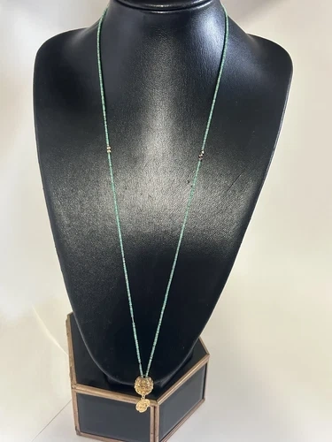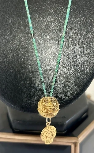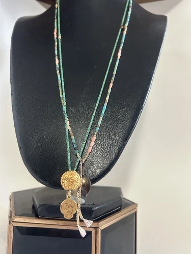 This pre-owned necklace set includes two 30-inch long beaded necklaces made from turquoise and coral heishi beads. The charms are made from 925 vermeil and feature a ball pendant with a sugar skull and a leaf motif with tiny gold tone beaded tassels, perfect for those who love a bohemian layered look. The necklaces are perfect for adding a pop of color to any outfit. With a warm beach vacation vibe, these necklaces are great for those who enjoy the beauty of the ocean. The coral & turquoise make for a stunning combination. In great condition. Any questions please ask.