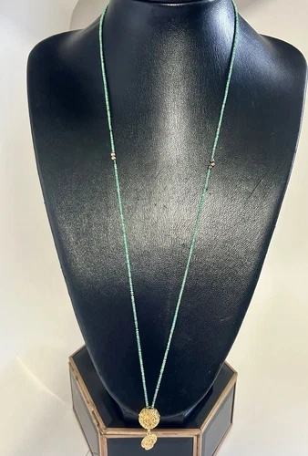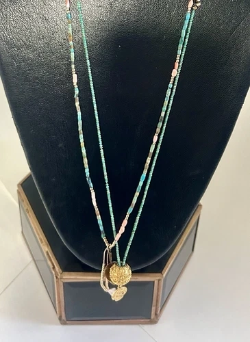 This pre-owned necklace set includes two 30-inch long beaded necklaces made from turquoise and coral heishi beads. The charms are made from 925 vermeil and feature a ball pendant with a sugar skull and a leaf motif with tiny gold tone beaded tassels, perfect for those who love a bohemian layered look. The necklaces are perfect for adding a pop of color to any outfit. With a warm beach vacation vibe, these necklaces are great for those who enjoy the beauty of the ocean. The coral & turquoise make for a stunning combination. In great condition. Any questions please ask.