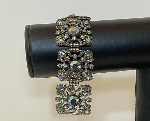Beautiful VINTAGE Unsigned Selro Selini Rhinestone BRACELET features gold tone metal and panel construction. It is approx 7” inches long and 1.25 inches wide. Each panel is about 1 inch long. It weighs about 65 grams and it has a folding clasp. In good condition. Thank you.