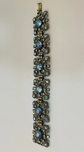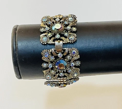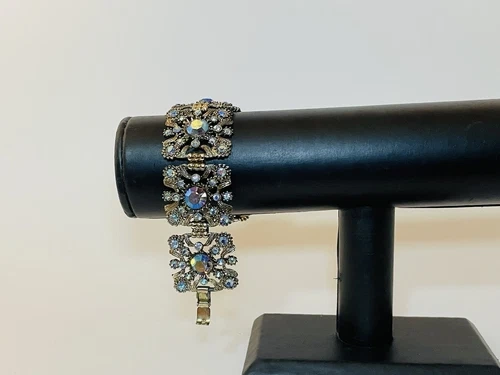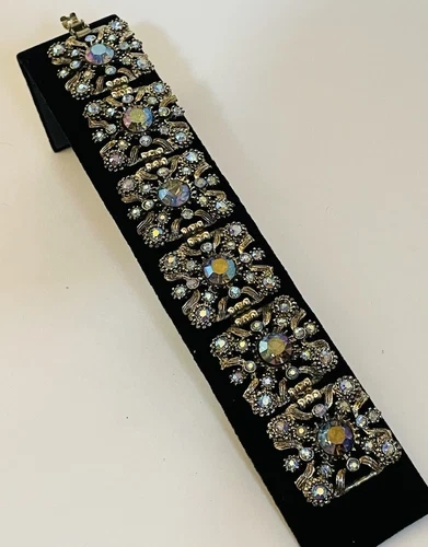 Beautiful VINTAGE Unsigned Selro Selini Rhinestone BRACELET features gold tone metal and panel construction. It is approx 7” inches long and 1.25 inches wide. Each panel is about 1 inch long. It weighs about 65 grams and it has a folding clasp. In good condition. Thank you.