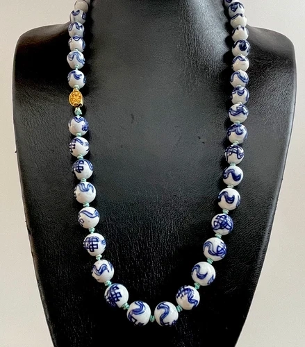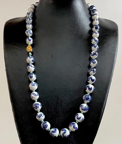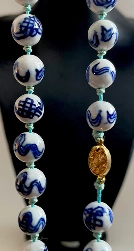 VINTAGE CHINESE PORCELAIN TRADE BEADS IN CLASSIC BLUE & WHITE ENAMEL - HAND PAINTED HAND KNOTTED SILK BEADED NECKLACE. The necklace is 26 inches long with a gold tone box clasp - 13 inch drop and it weighs 88 grams. It’s in great condition. Thank you.
