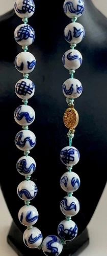VINTAGE CHINESE PORCELAIN TRADE BEADS IN CLASSIC BLUE & WHITE ENAMEL - HAND PAINTED HAND KNOTTED SILK BEADED NECKLACE. The necklace is 26 inches long with a gold tone box clasp - 13 inch drop and it weighs 88 grams. It’s in great condition. Thank you.