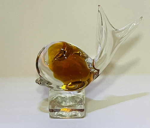 Elevate your decor with the Vintage IceT Arte Murano Glass Fish Figurine, a stunning piece that exudes elegance and timeless charm. Crafted with precision, this hand-blown glass figurine features rich amber hues and intricate details, capturing the allure of marine life in a form that's both decorative and captivating. Originating from Italy and bearing the distinguished Murano brand, this figurine stands as a testament to skillful art glass production techniques. Complete with its original label backstamp.