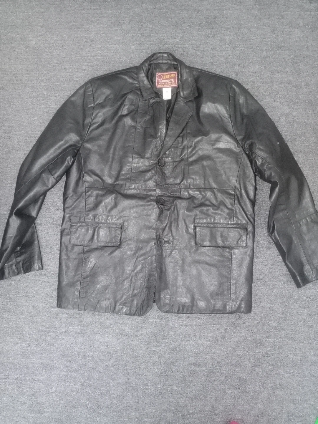Selling a Leather Garments black leather blazer in size XL. This blazer is made of 100% leather and manufactured in Pakistan. It's a stylish piece for any wardrobe!