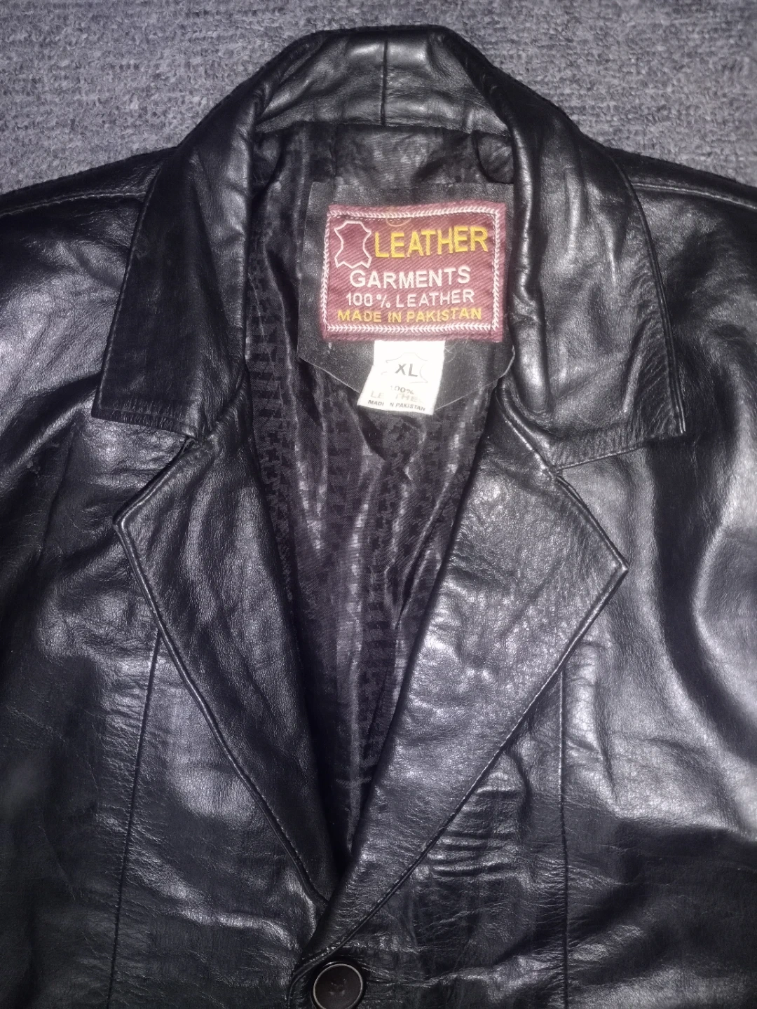 Selling a Leather Garments black leather blazer in size XL. This blazer is made of 100% leather and manufactured in Pakistan. It's a stylish piece for any wardrobe!