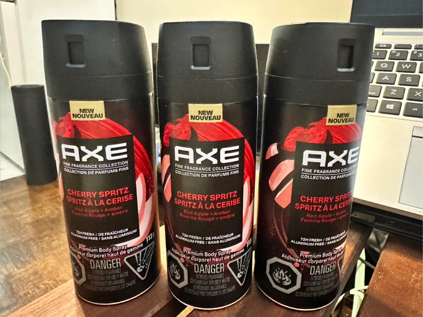 I have 3 Axe Fine Fragrance Collection Cherry Spritz body spray for sale. It's a premium body spray with a scent of red apple and amber. It's aluminum-free and provides 72 hours of freshness