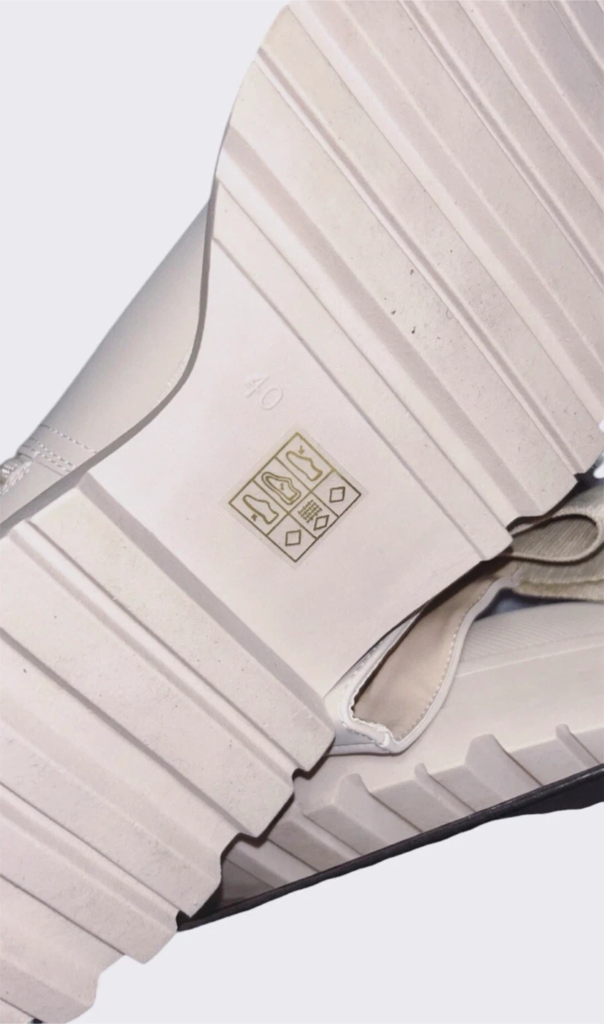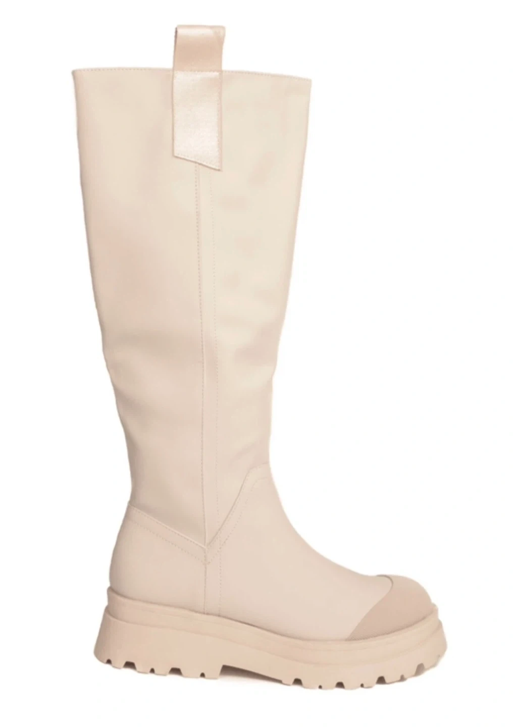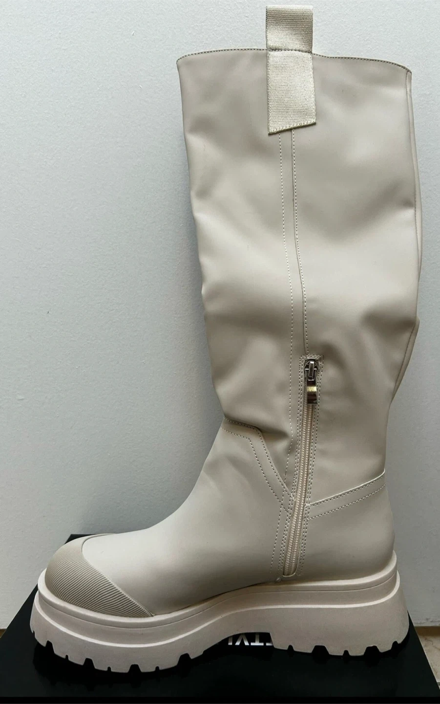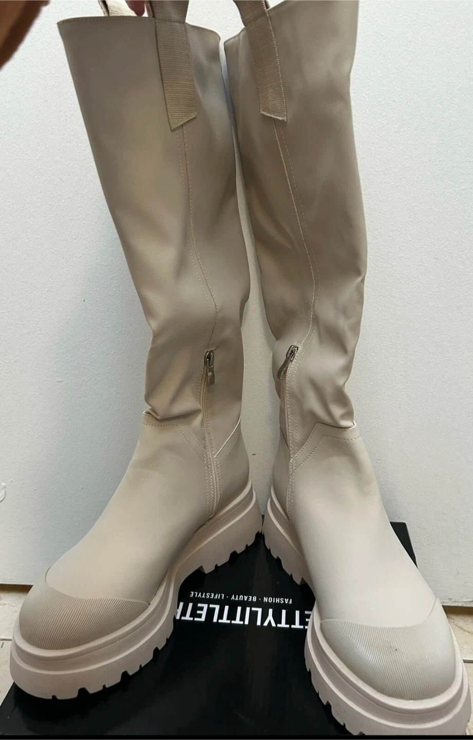 These are a pair of knee-high boots from PrettyLittleThing. They are beige and feature a chunky lug sole. They come in the original box!