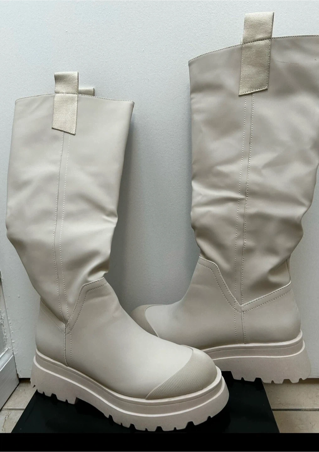 These are a pair of knee-high boots from PrettyLittleThing. They are beige and feature a chunky lug sole. They come in the original box!