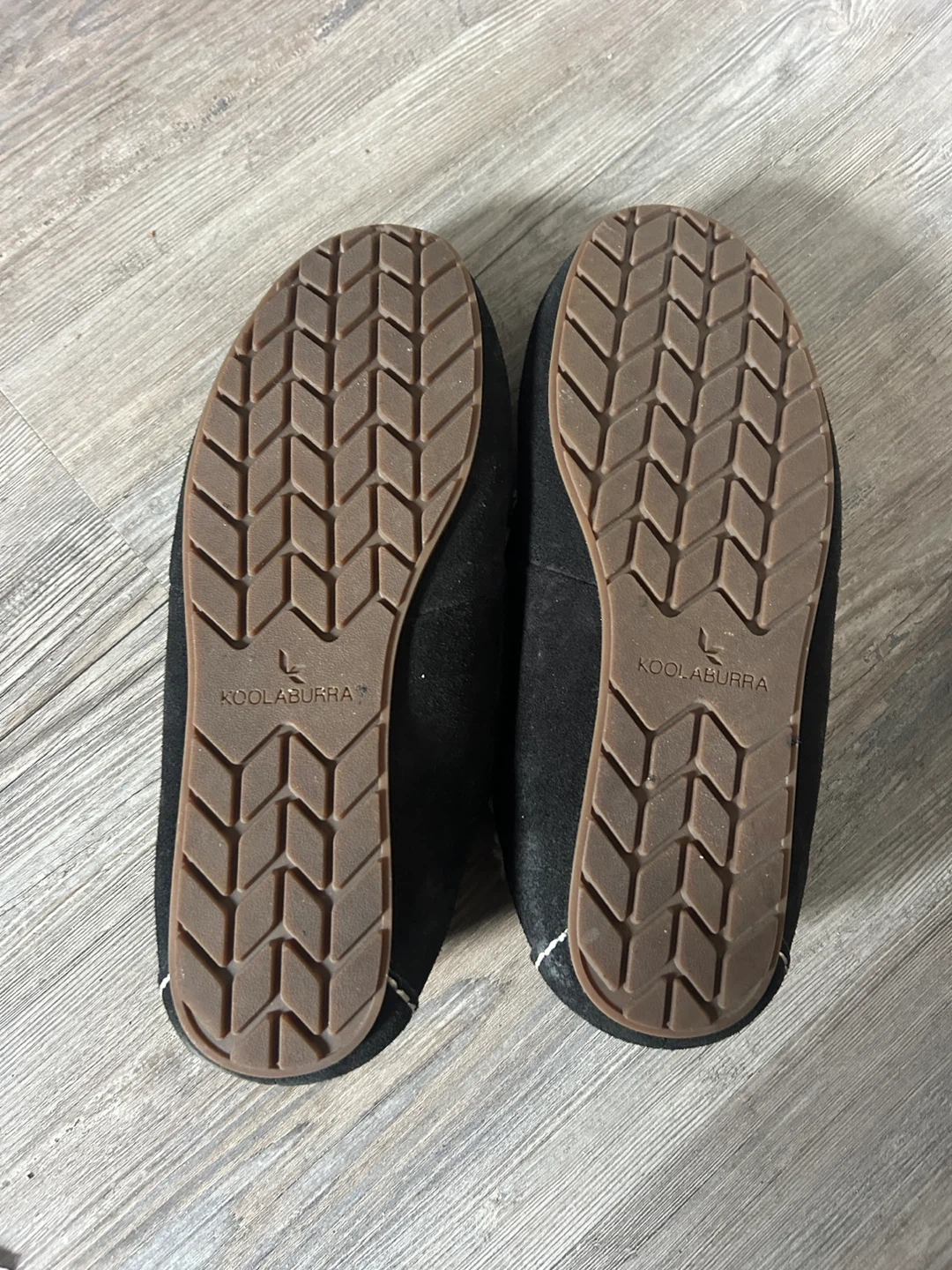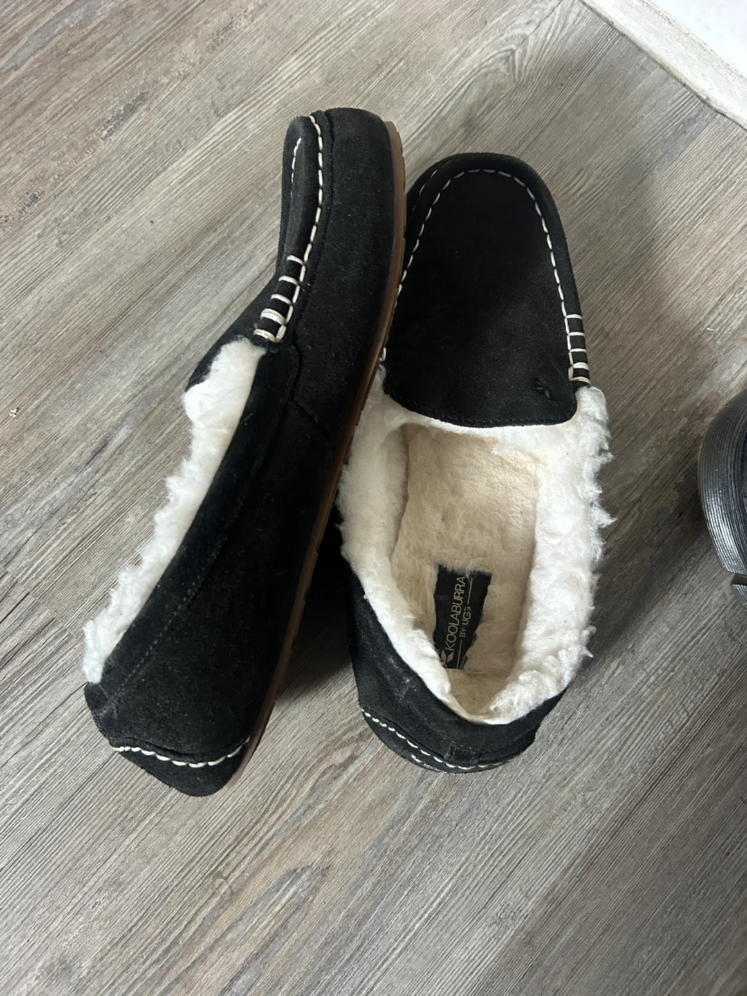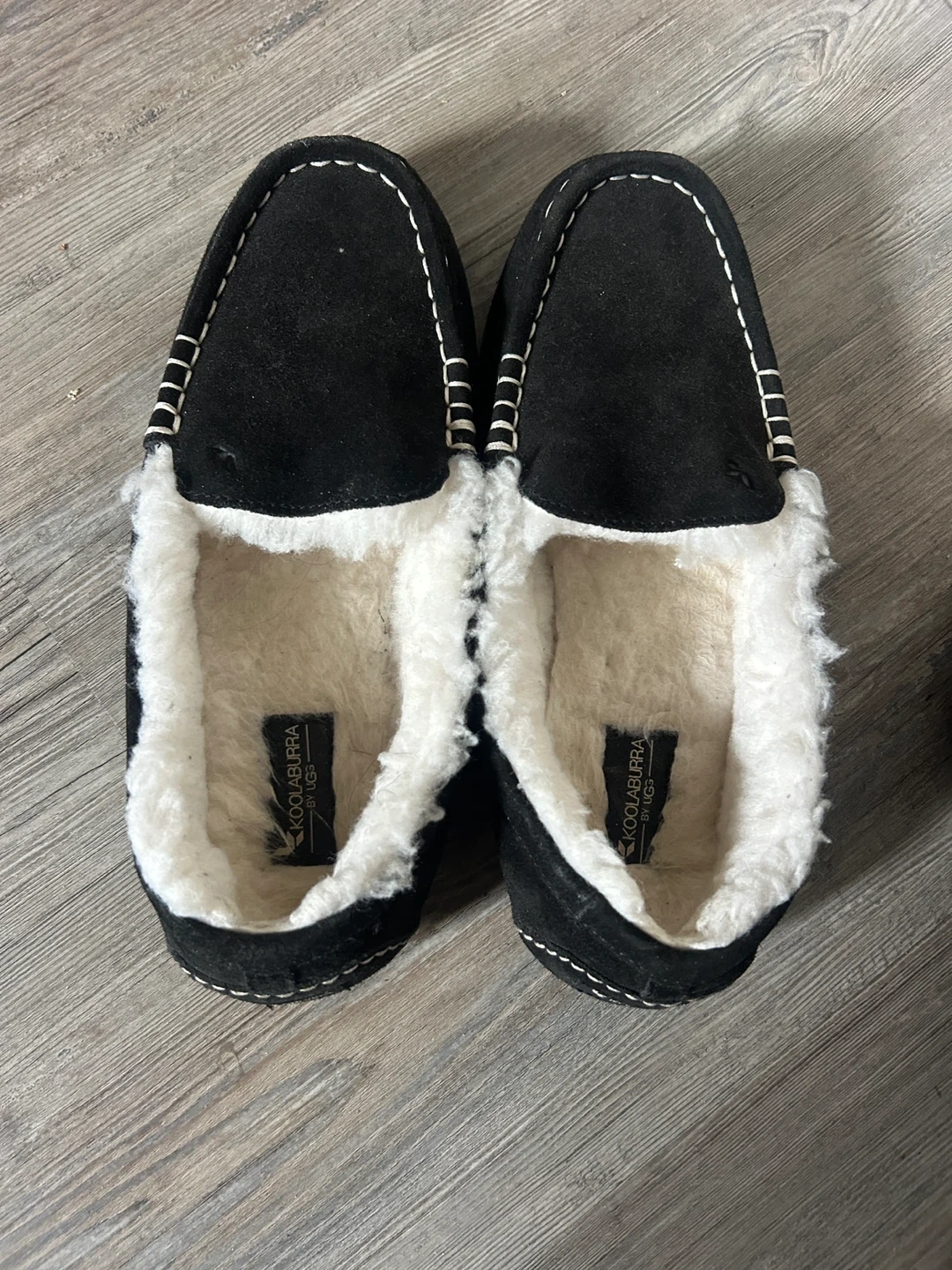 Selling a pair of UGG Koolaburra moccasins in women's size 10. They are black with a suede leather and sheepskin material. These are great for keeping your feet warm and cozy!