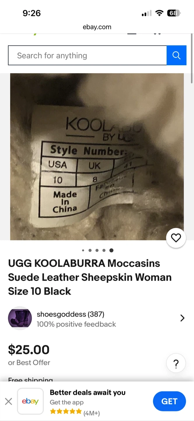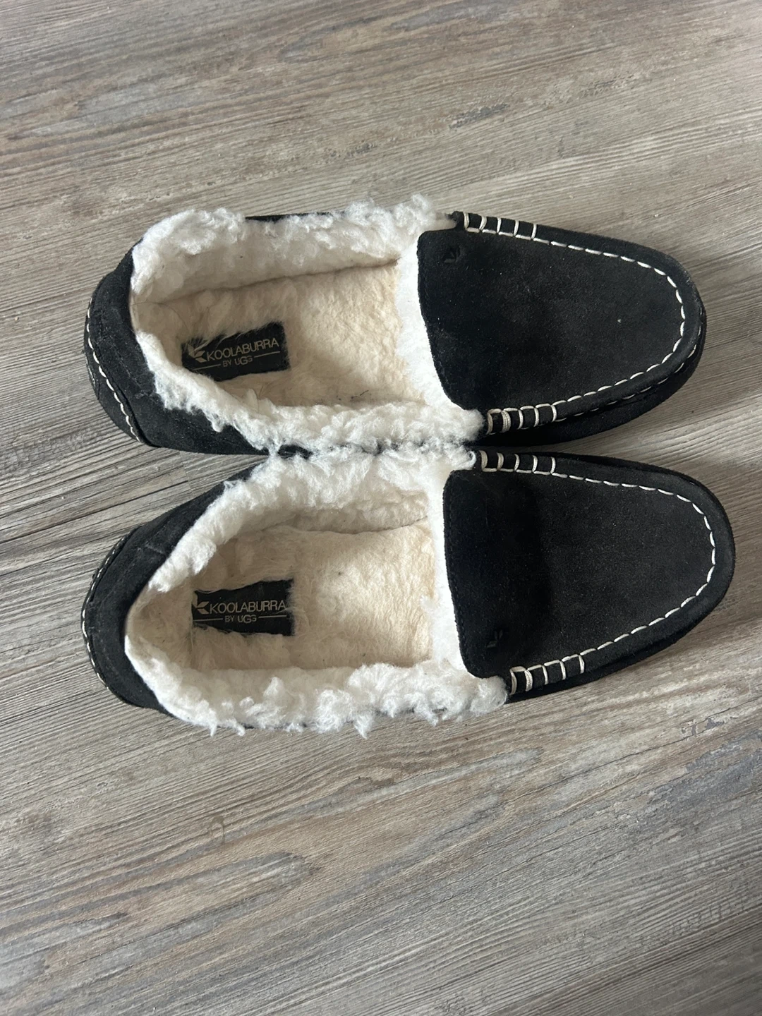 Selling a pair of UGG Koolaburra moccasins in women's size 10. They are black with a suede leather and sheepskin material. These are great for keeping your feet warm and cozy!