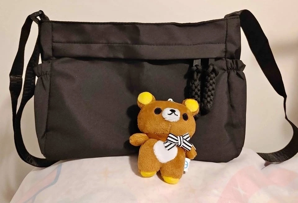 Medium sized black cross body bag with a Rilakkuma charm.