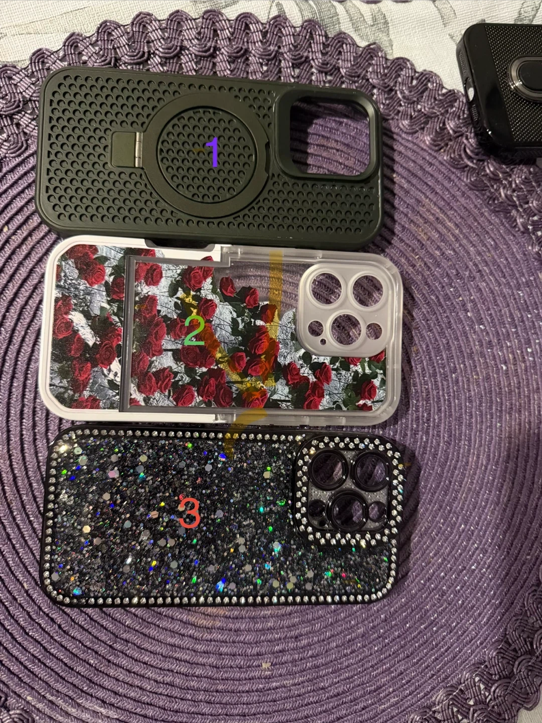Selling three iPhone cases. There's a green case, a floral case with red roses, and a black glitter case. All in good condition!