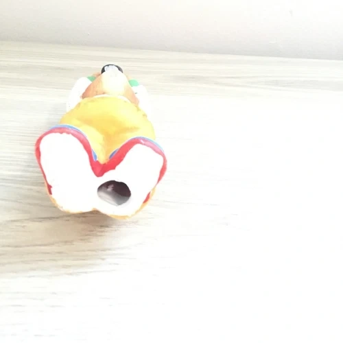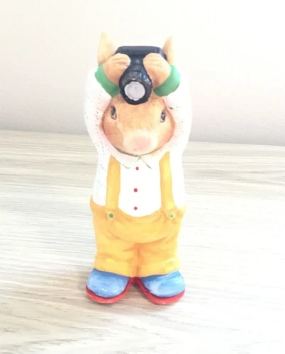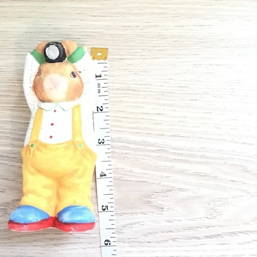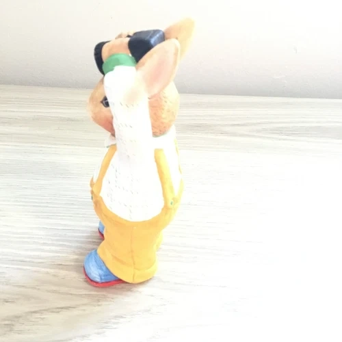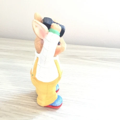 Capture the charm of this cute bunny figurine! This whimsical rabbit is dressed in yellow overalls, a white shirt with red buttons, and bright blue shoes, holding a camera above its head as if taking a picture. Perfect for collectors of bunny figurines, photographers, or lovers of unique home decor.