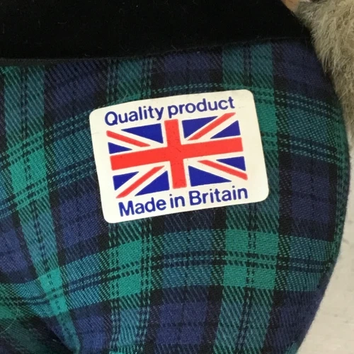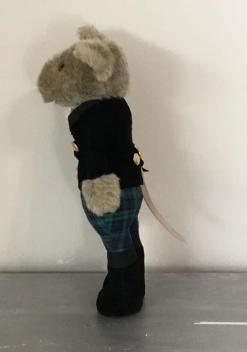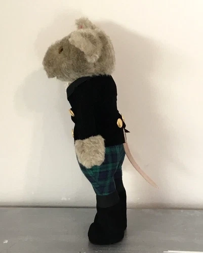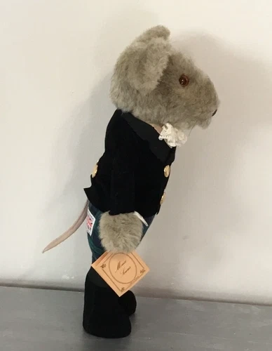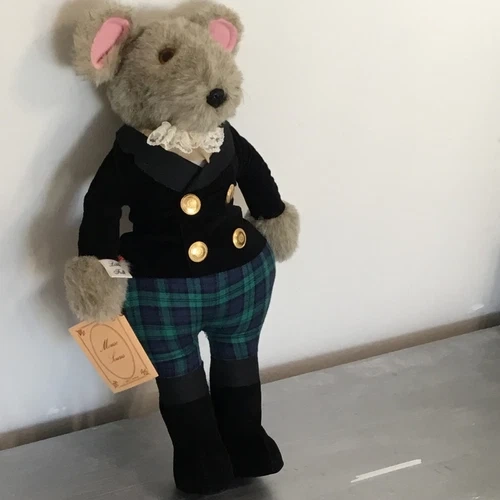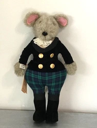 This collectible "Mouse Louis" plush by Little Folk is a charming representation of Victorian and Edwardian fashion. At approximately 14 inches tall, it stands in a distinguished Victorian Edwardian-inspired outfit. Louis wears a black double-breasted jacket with gold buttons, lace collar, plaid trousers, and black boots. The plush is in good condition with its original tag still attached, making it an ideal addition for collectors of vintage plush toys or fans of historical-themed decor.