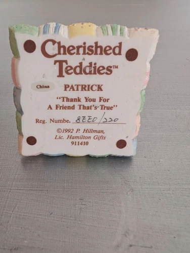 Vintage 1992 Cherished Teddies “Patrick” #911410 “Thank you for a friend that’s true” 8EE0/220 P. Hillman. Condition is "Used". S-C-T-1