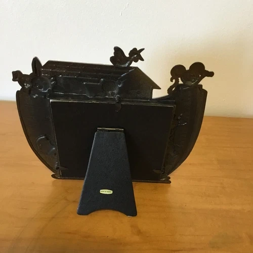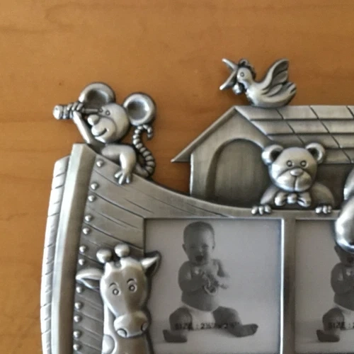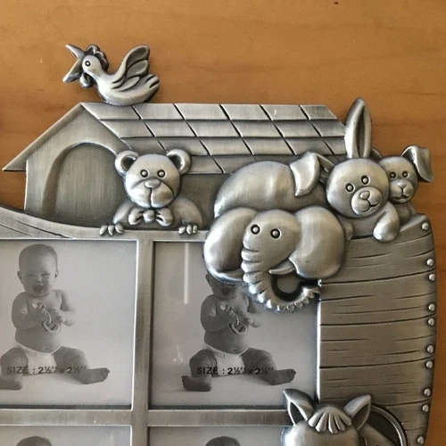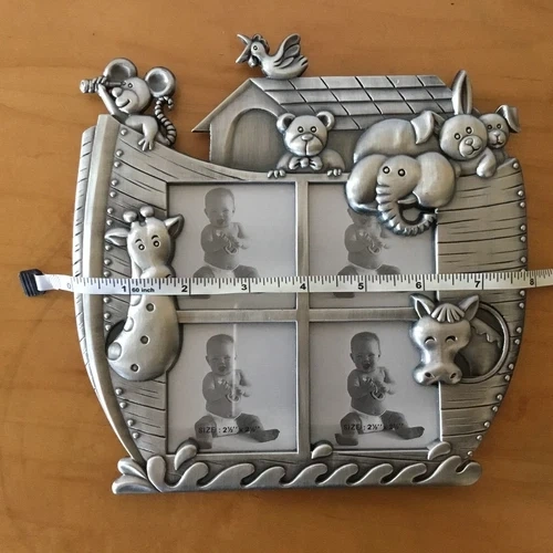 Vintage pewter children's photo frame with various animals (giraffe, horse, bear, elephant, rabbit, mouse, and bird) and four photo sections. It dates from the early 1990s. It stands on a black velvet leg at the back and measures 19.5cm high and 20cm wide. The overall photo size is 5 inches x 5 inches (or 2.5 x 2.5 inches for each four photos). (please view images and Zoom). This would make a lovely gift or frame for those special family photographs. I accept reasonable offers. I appreciate you stopping by! Enjoy your day.