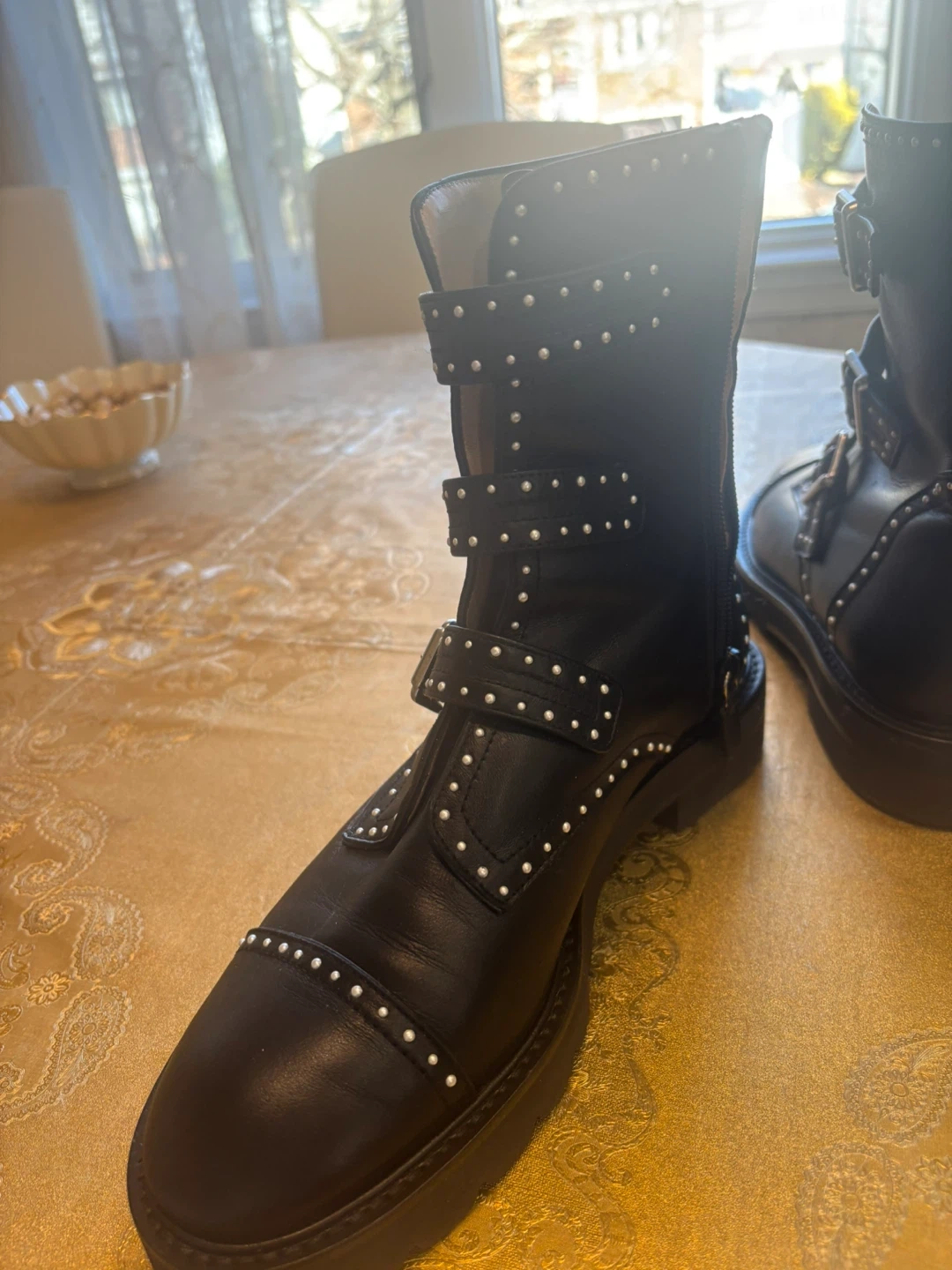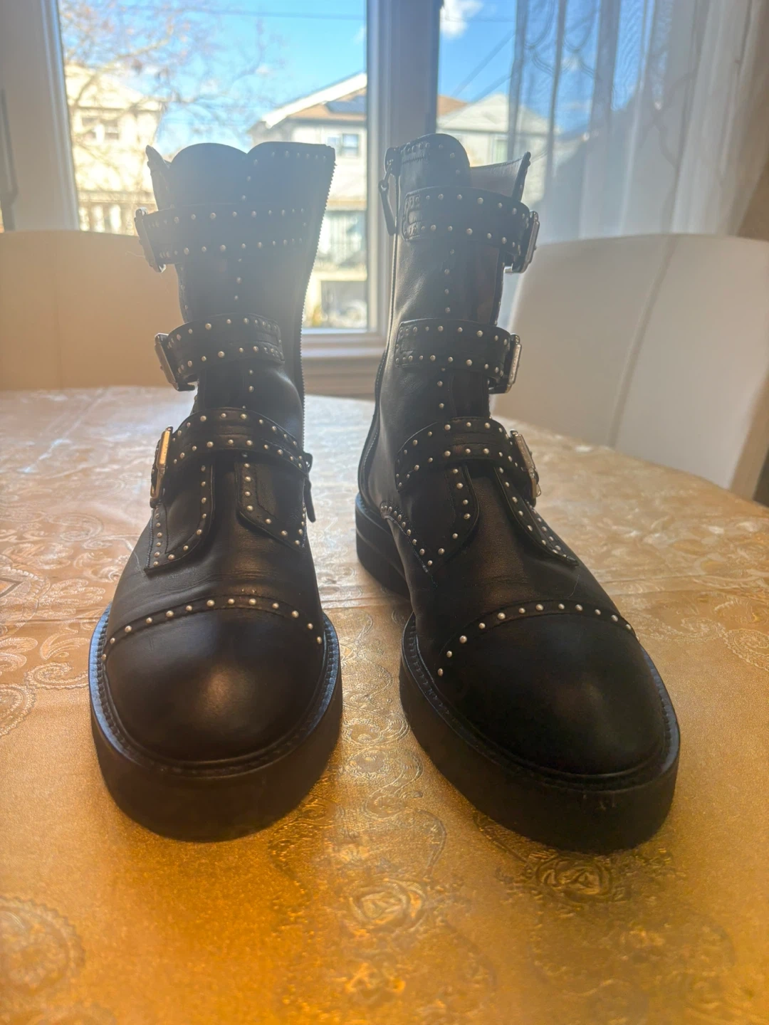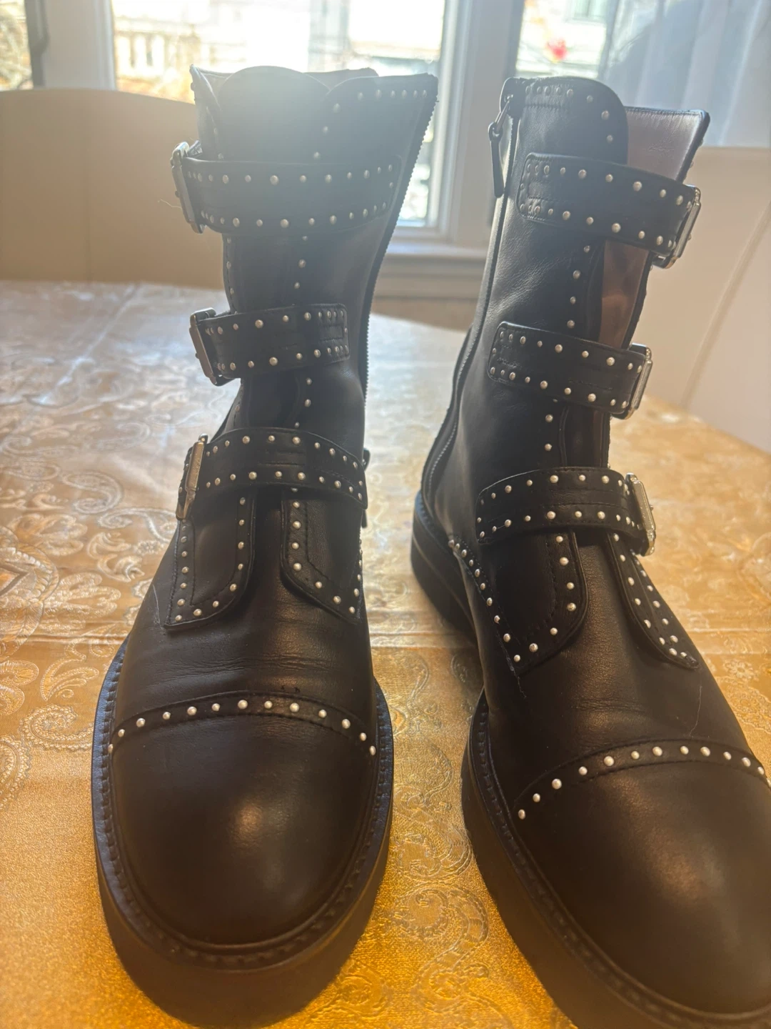 Selling a pair of Stuart Weitzman black leather boots. They feature a studded design and buckle straps. The size is US 9.5