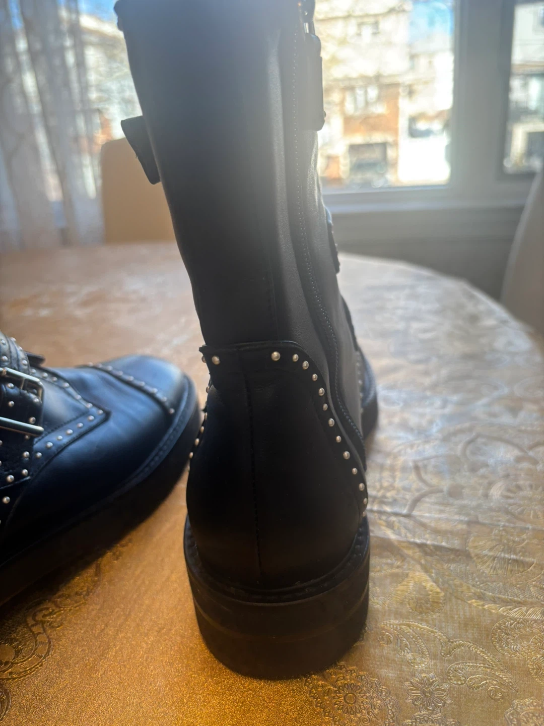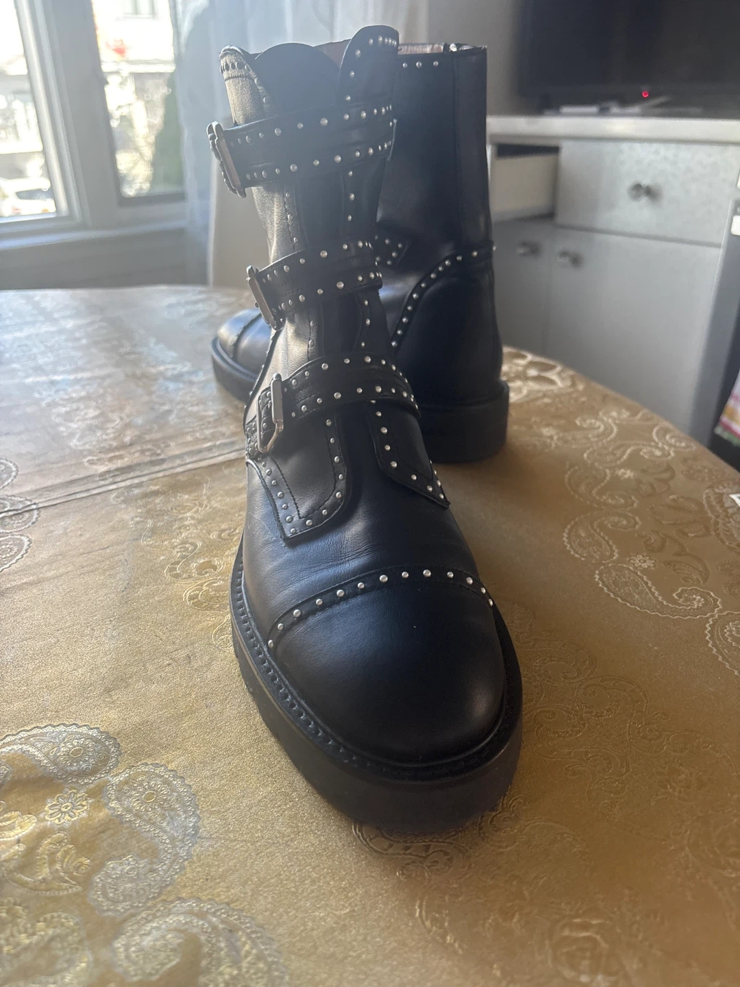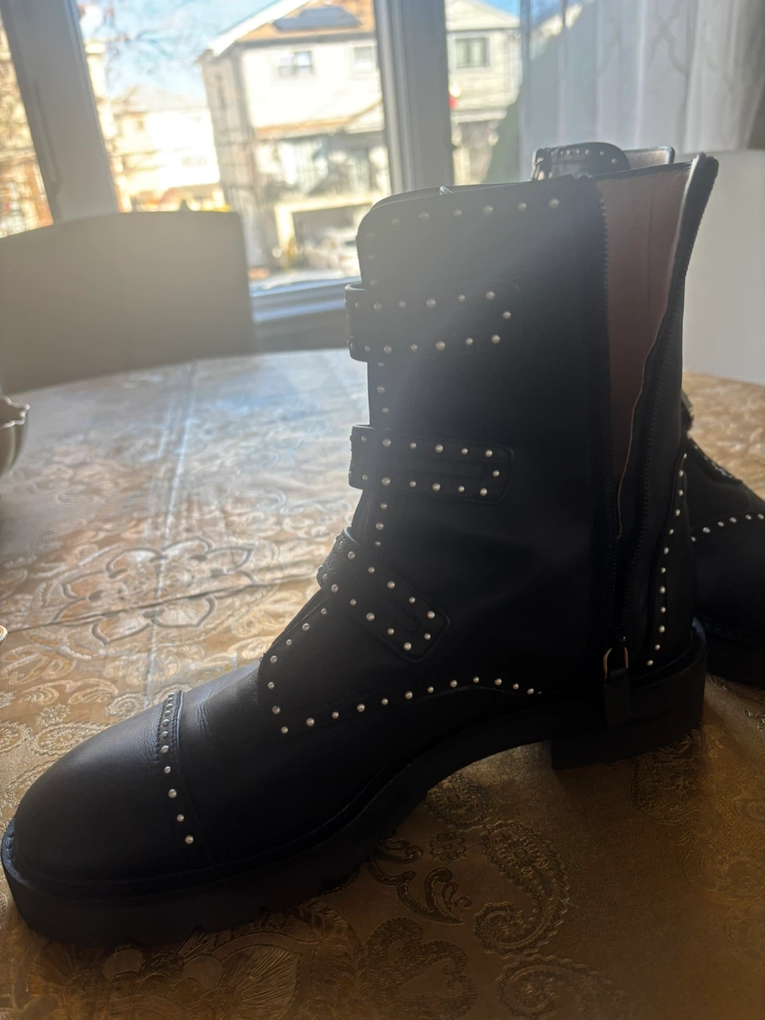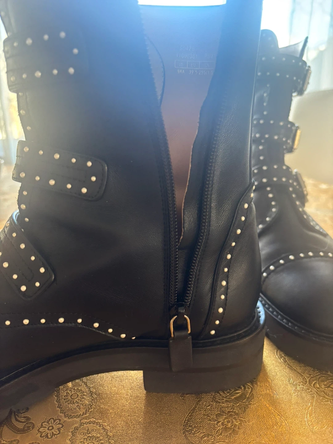 Selling a pair of Stuart Weitzman black leather boots. They feature a studded design and buckle straps. The size is US 9.5