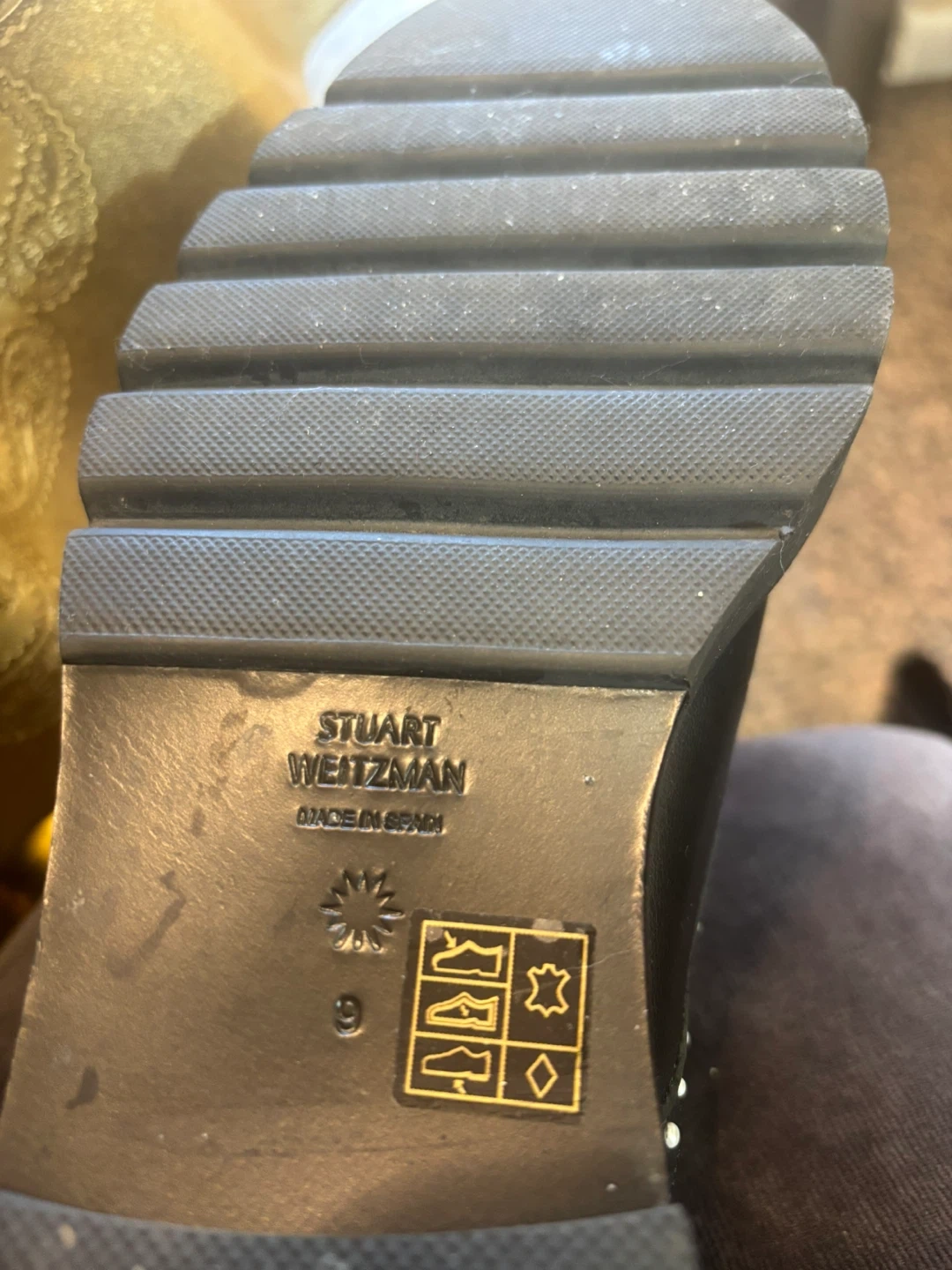 Selling a pair of Stuart Weitzman black leather boots. They feature a studded design and buckle straps. The size is US 9.5