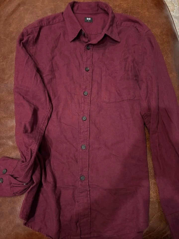 Uniqlo Mens 100% cotton shirts long sleeve. Button down. With collar dark burgundy, blue, and plaid colour. Excellent condition. Size S