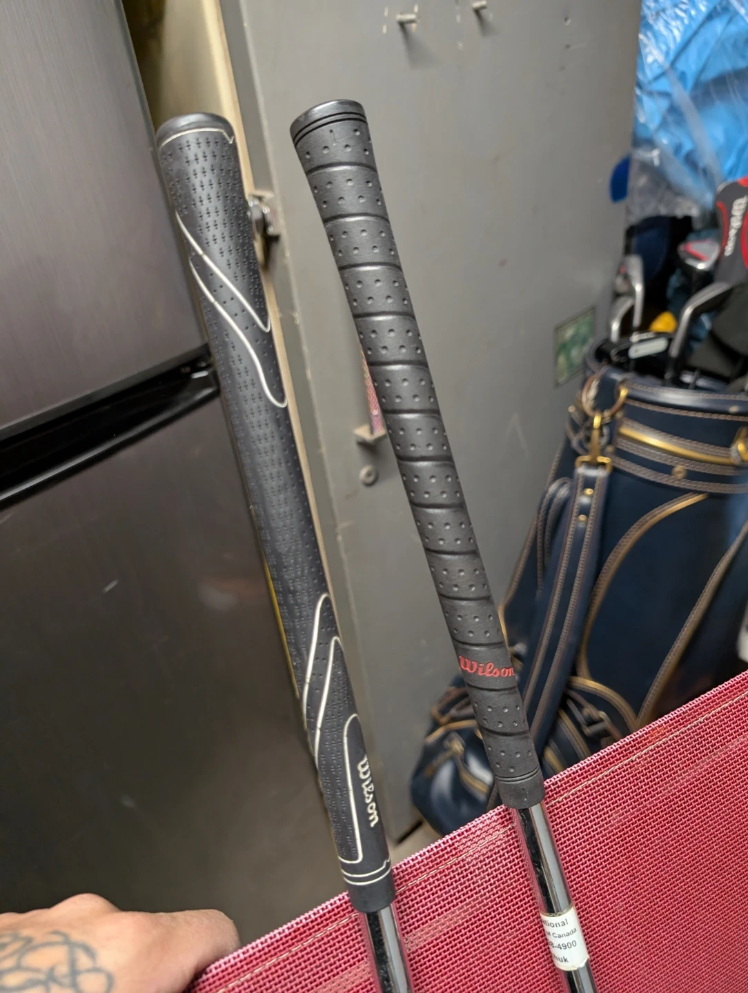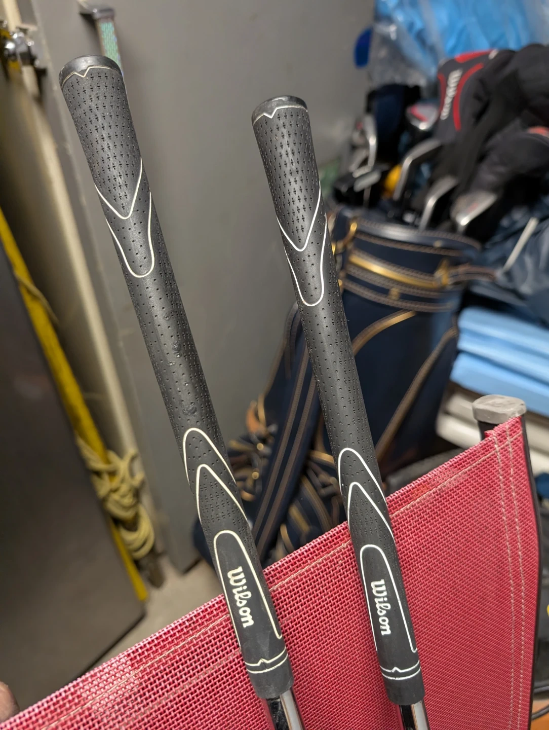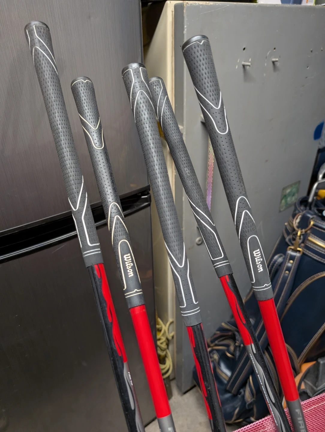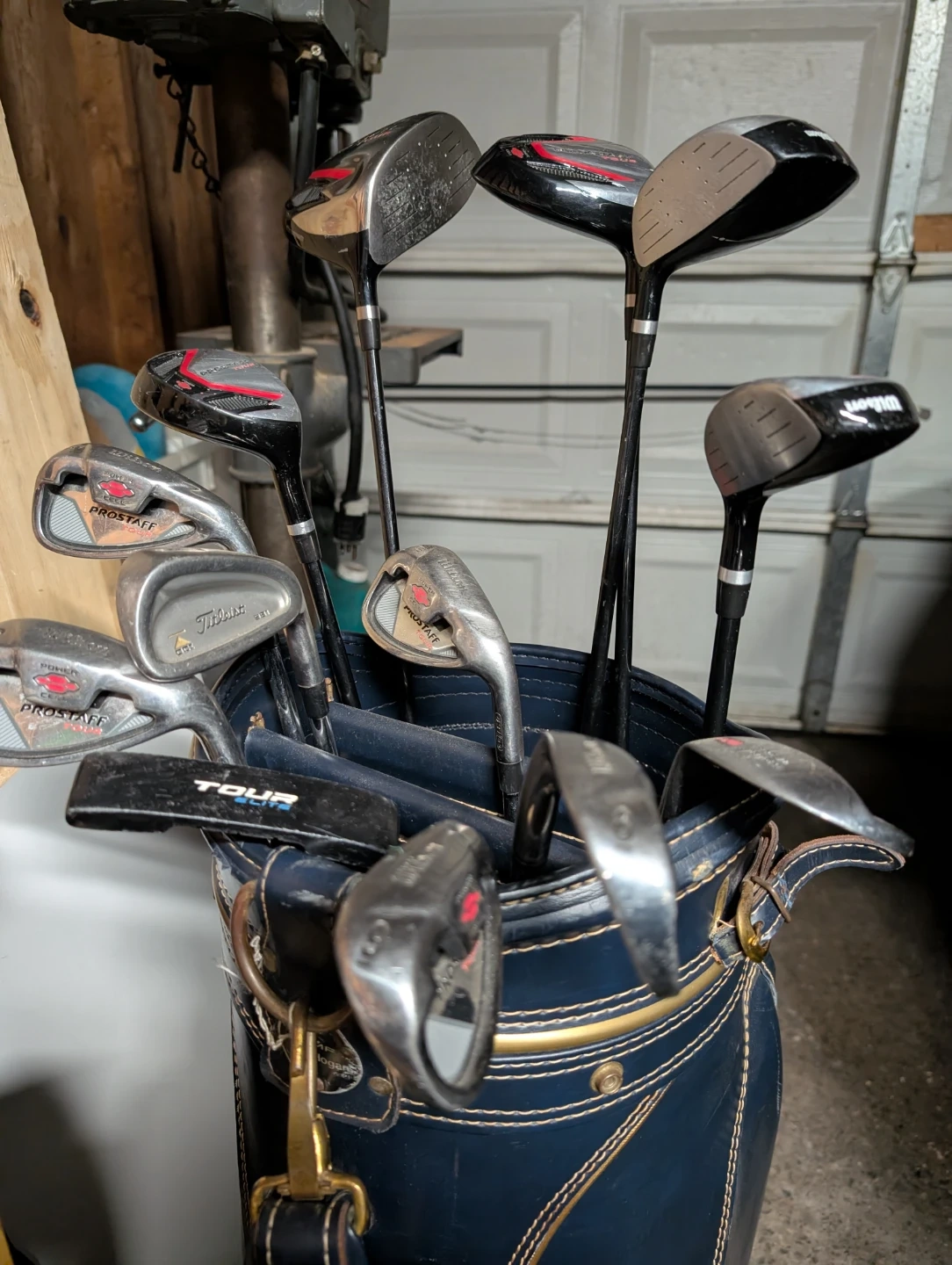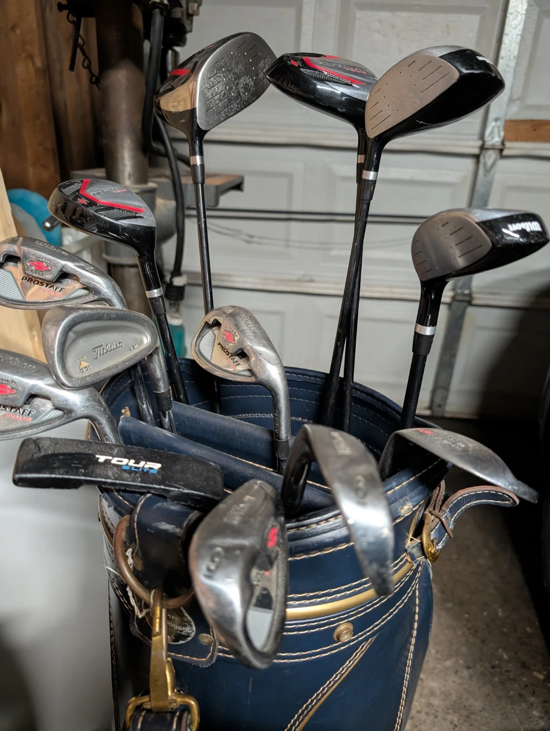 Selling a set of golf clubs, including Wilson and Titleist irons, and Prostaff woods. They come with a TPC (Tournament Players Championship) golf bag. Great for anyone looking to upgrade their golf gear!