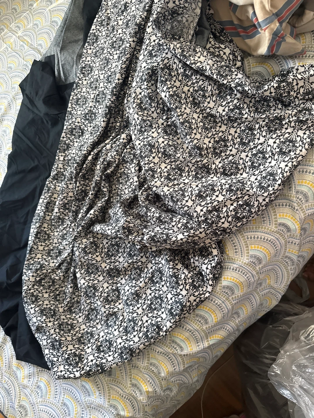Selling some fabric pieces, including a black and white patterned piece and a solid black piece. Great for crafting or sewing projects! Flat bed sheet gray colour full bed