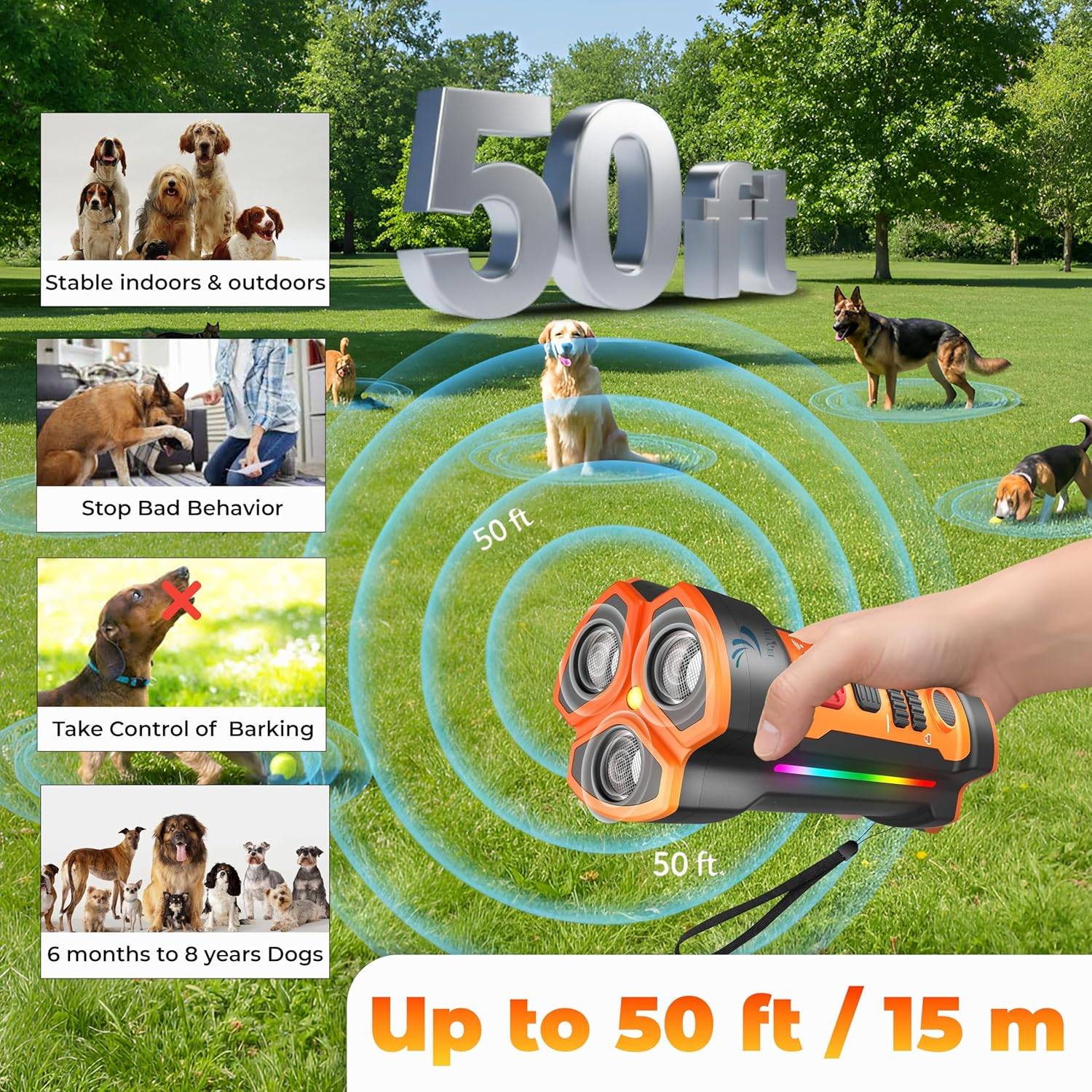Upgraded dog bark deterrent —delivering 3X the coverage to quickly stop barking, biting, and jumping behaviors. Ideal for anti-barking training, safer than bark collar, more effective than a dog whistle. Works for 97% dogs from 6 months to 8 years without hearing impairments.