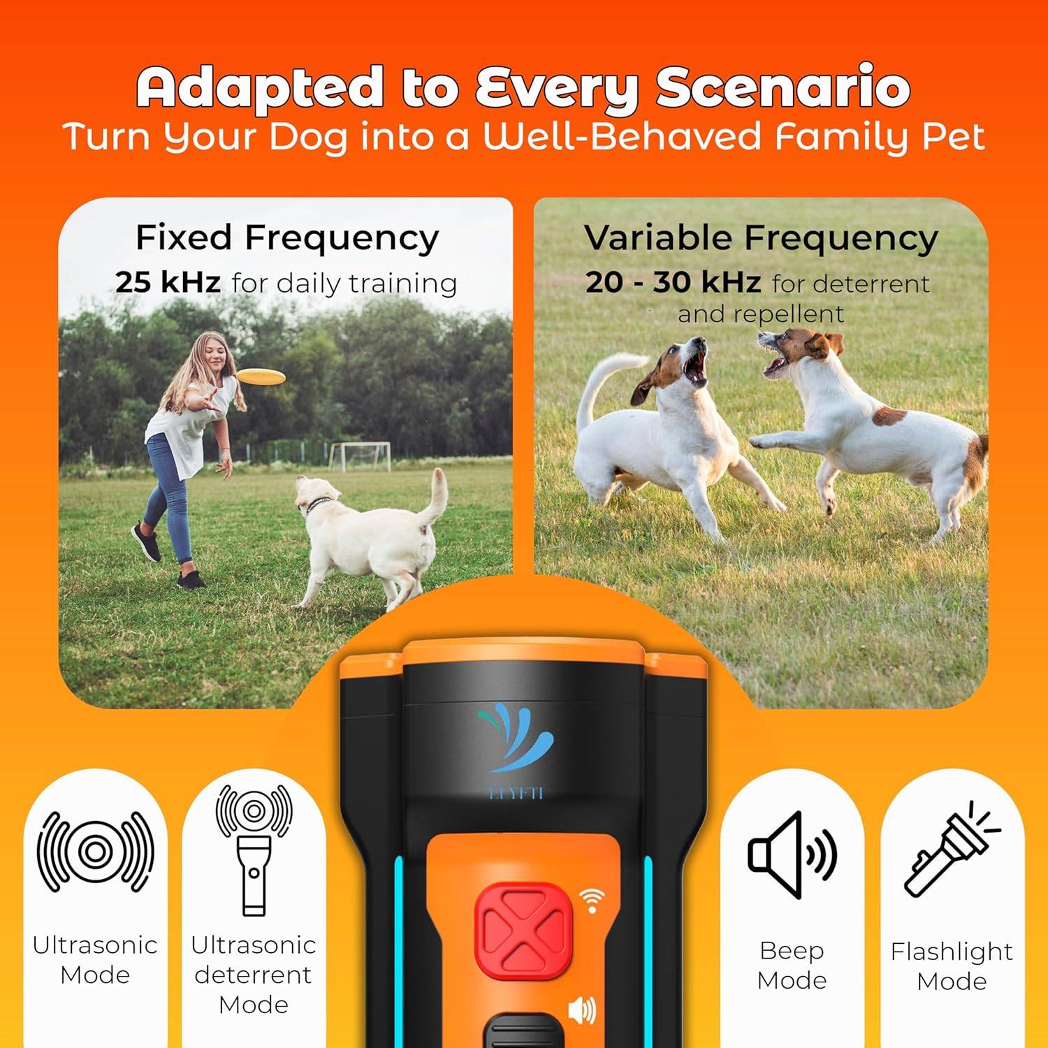 Train without pain using two ultrasonic frequencies (20–30kHz) and a pre-warning beep to gently stop barking, biting, or jumping. Designed to help your dog understand commands quickly — without using shock or physical punishment.