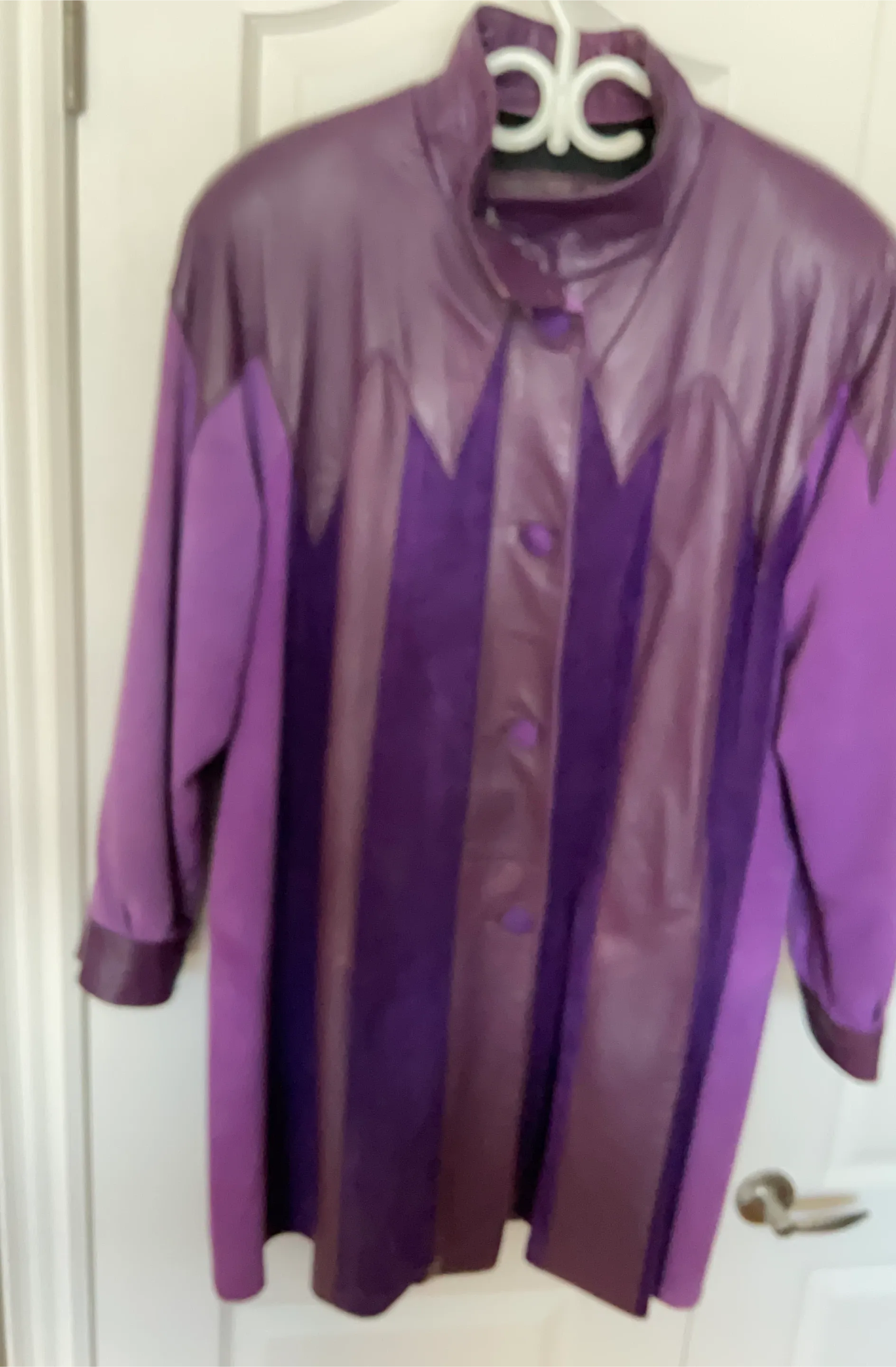 A stylish purple leather jacket, perfect for adding a pop of colour to your wardrobe! It features a unique design with different shades of purple.
