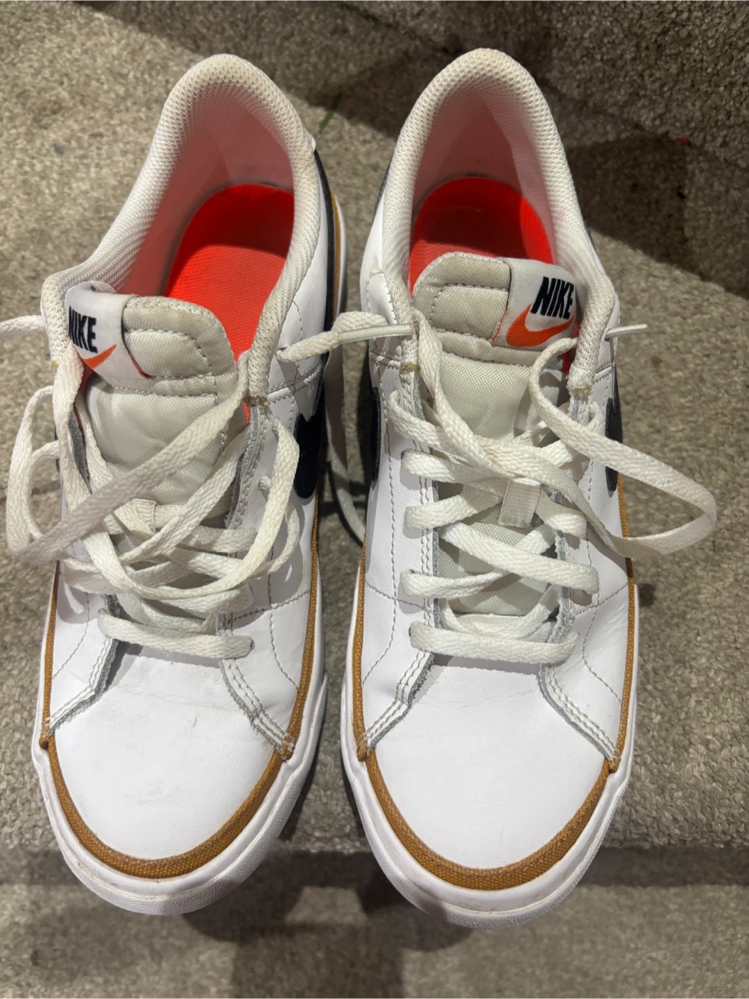 Selling a pair of Nike Court Legacy shoes in size 6.5 They're white with a brown trim and the classic Nike swoosh. Great for everyday wear.