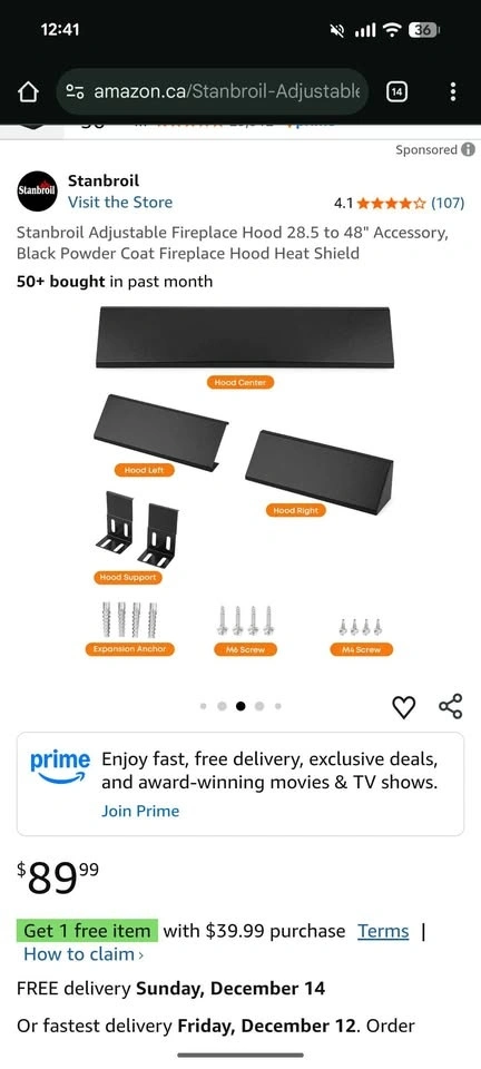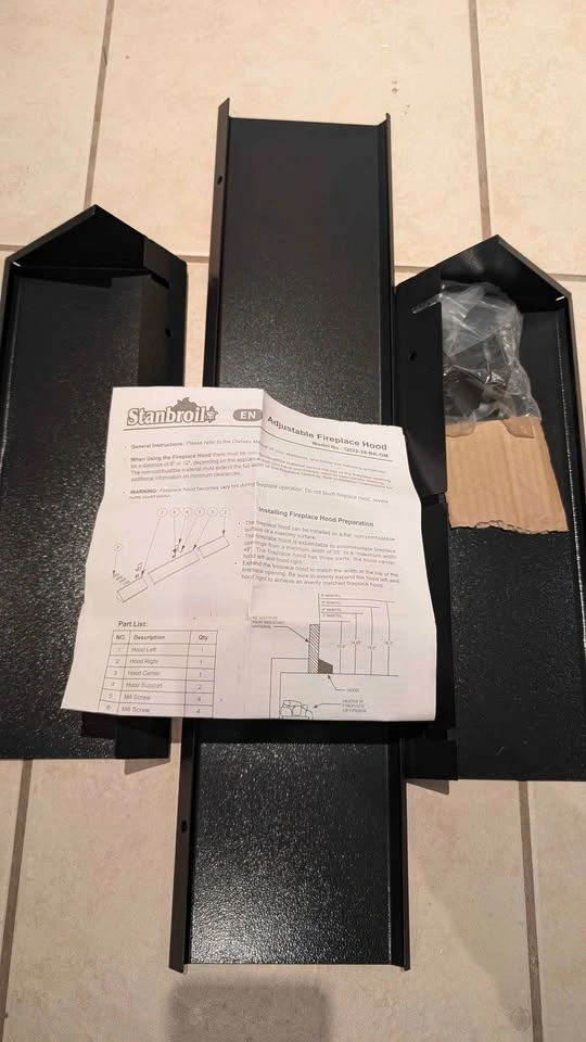 Stanbroil Adjustable Fireplace Hood 28.5 to 48" Accessory, Black Powder Coat Fireplace Hood Heat Shield. Brand New still in box. Amazon price: 90 CAD + tax. Asking price: 40 CAD. Check my other listings for fantastic Deals on household and Christmas stuff!