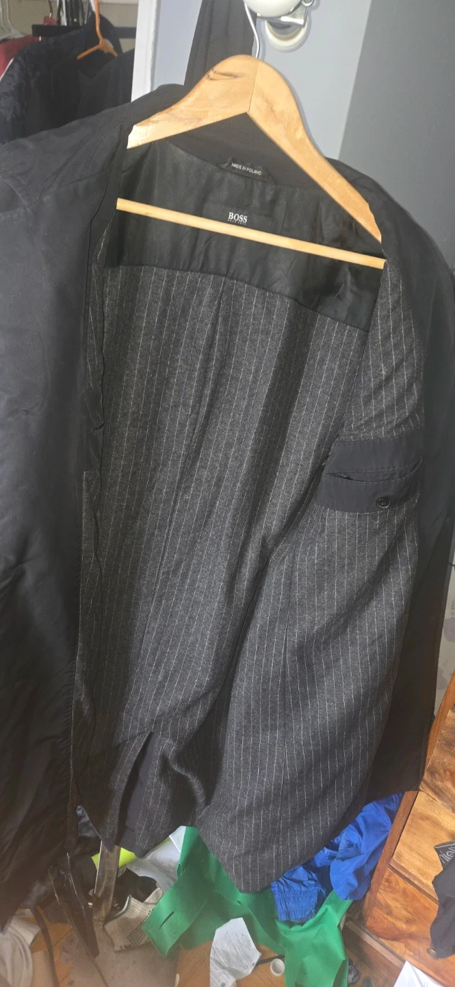 BOSS black jacket with a pinstripe lining. Made in Poland. It's a classic coat for cooler weather.