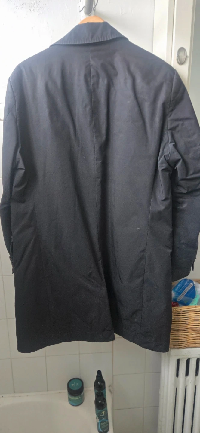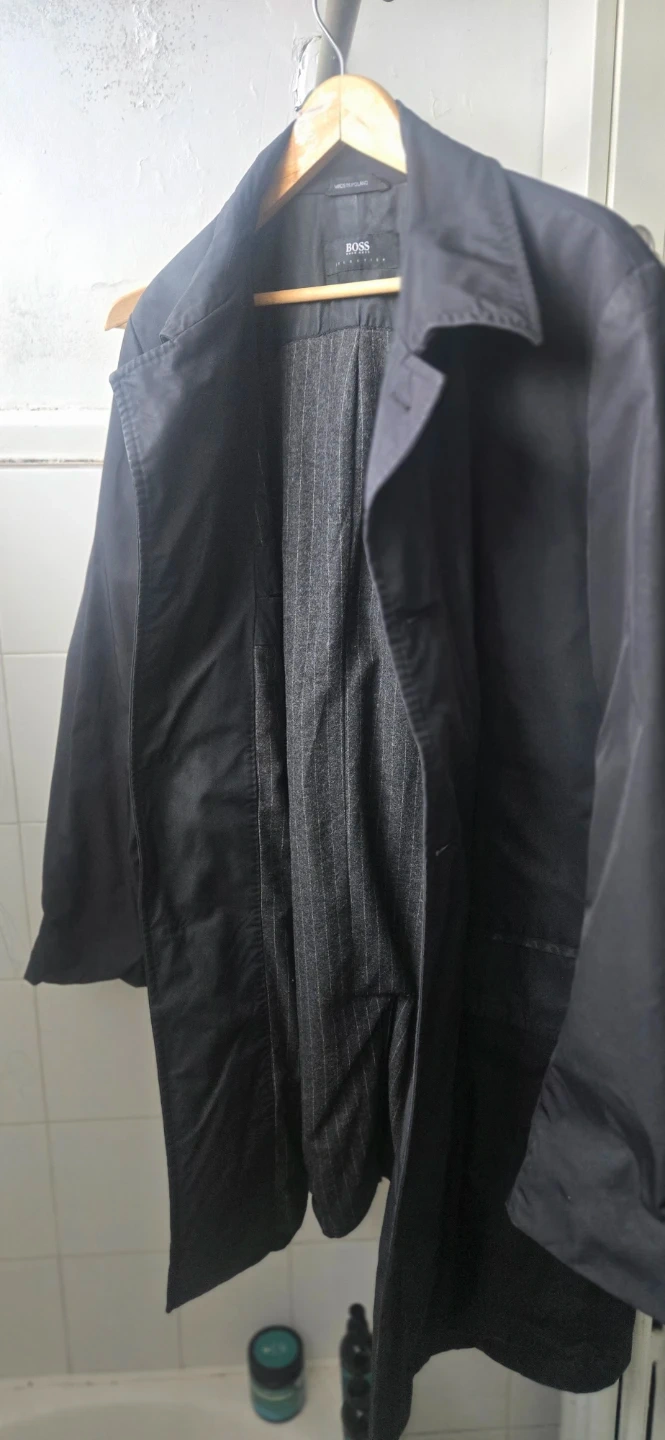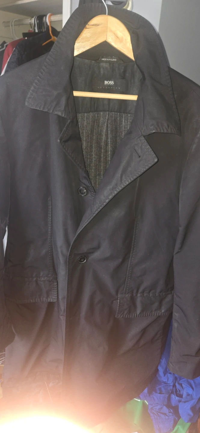 BOSS black jacket with a pinstripe lining. Made in Poland. It's a classic coat for cooler weather.