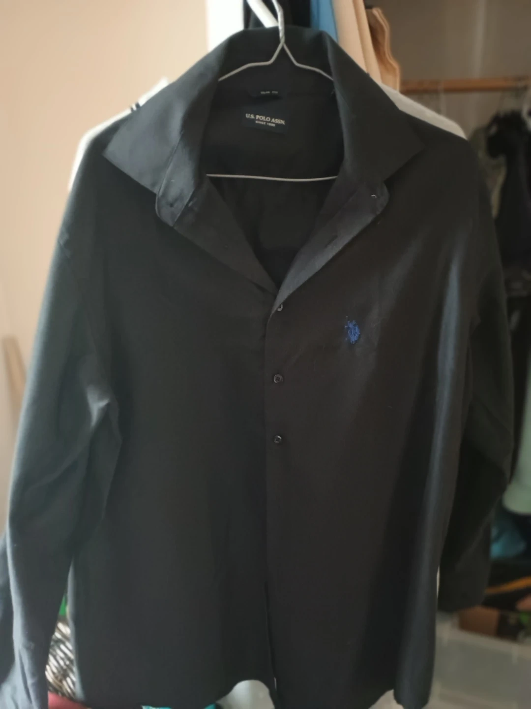 This is a U.S. Polo Assn. slim fit dress shirt in black. It's a size large with a 16-16.5 inch neck and 32/33 inch sleeve. It's a classic button-up style.