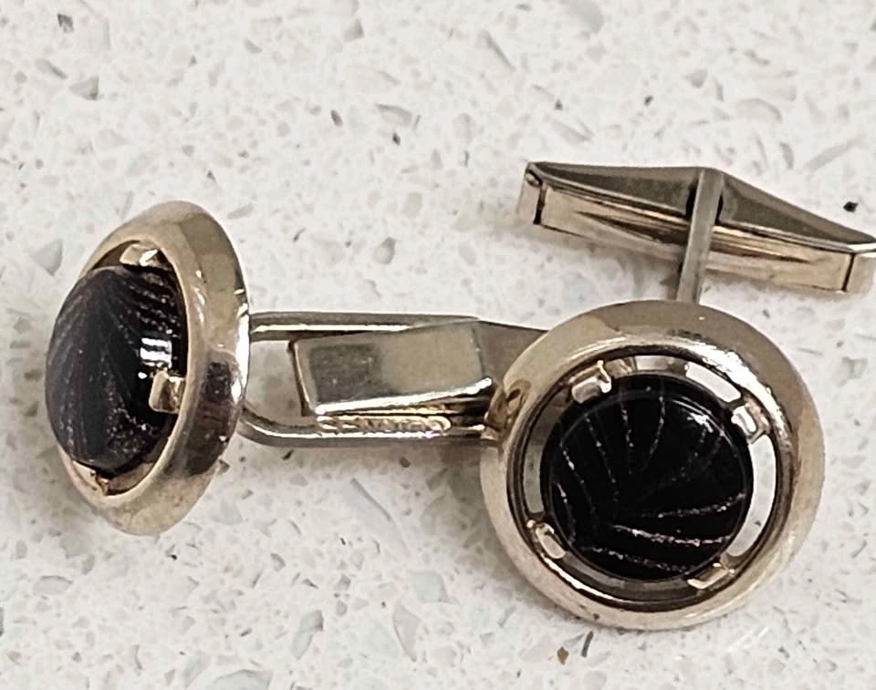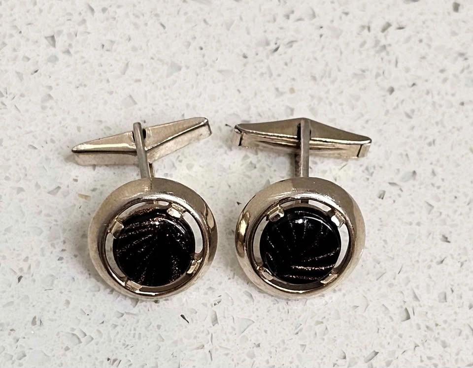 This sale is for one pair of vintage Senator gold tone cufflinks by Canadian accessories company Sherman. They feature a hinged, gold-tone circle with a nice goldstone and black detailed stone that is very reminiscent of tigers eye. There is a simple wide bezel around the stones. Closure: Bullet back toggle. Status: Vintage/Pre-owned. Condition: Very Good-Excellent. FREE PICK UP IN CALGARY ALBERTA CANADA.