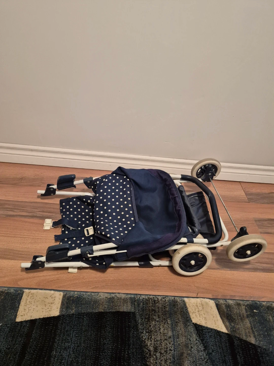 This is a navy blue umbrella stroller, perfect for on-the-go parents. It features a sun canopy and a storage basket underneath. It folds compactly for easy transport and storage.