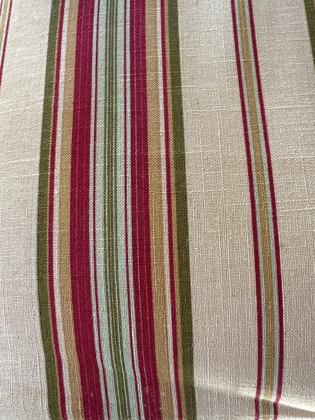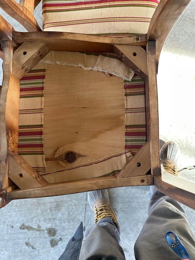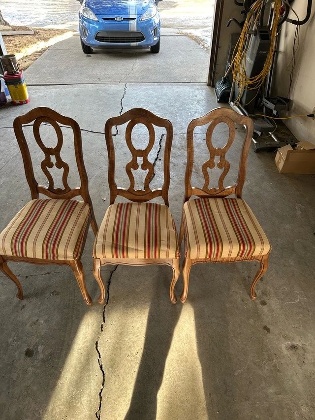 Set of three used dining room chairs with a striped seat and wooden frame. These chairs show signs of wear but are still sturdy and functional. They're perfect for adding character to your dining space. A matching dining table is available in my other ad; I'm willing to make a deal if you buy both the chairs and table together. Cash accepted.