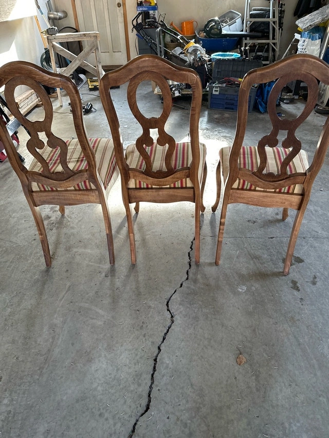 Set of three used dining room chairs with a striped seat and wooden frame. These chairs show signs of wear but are still sturdy and functional. They're perfect for adding character to your dining space. A matching dining table is available in my other ad; I'm willing to make a deal if you buy both the chairs and table together. Cash accepted.