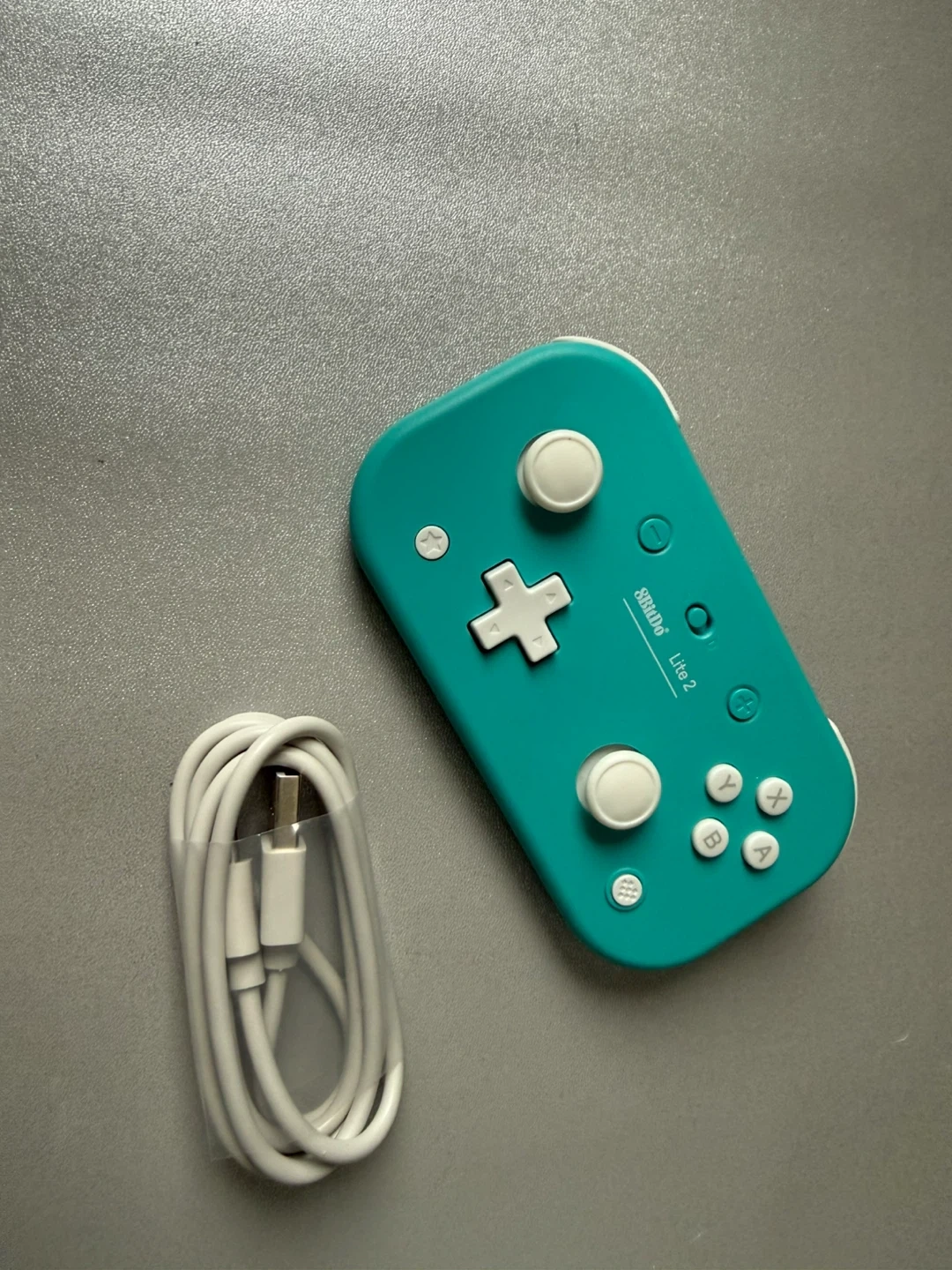 This bundle includes a turquoise Nintendo Switch Lite console, a Skull & Co. GripCase with interchangeable grips, and a USB-C charging cable. It also comes with a black protective carrying case and 8bitdo controller.