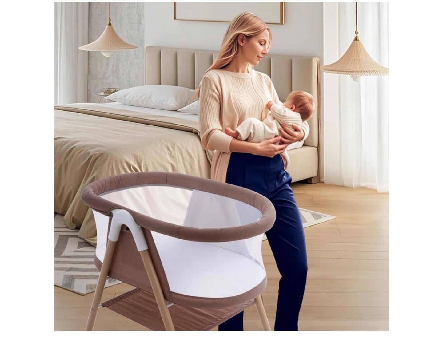 This baby bassinet is designed for convenience. It features a breathable mesh and a mosquito net for baby's comfort and safety. It also comes with a travel bag for easy transport.