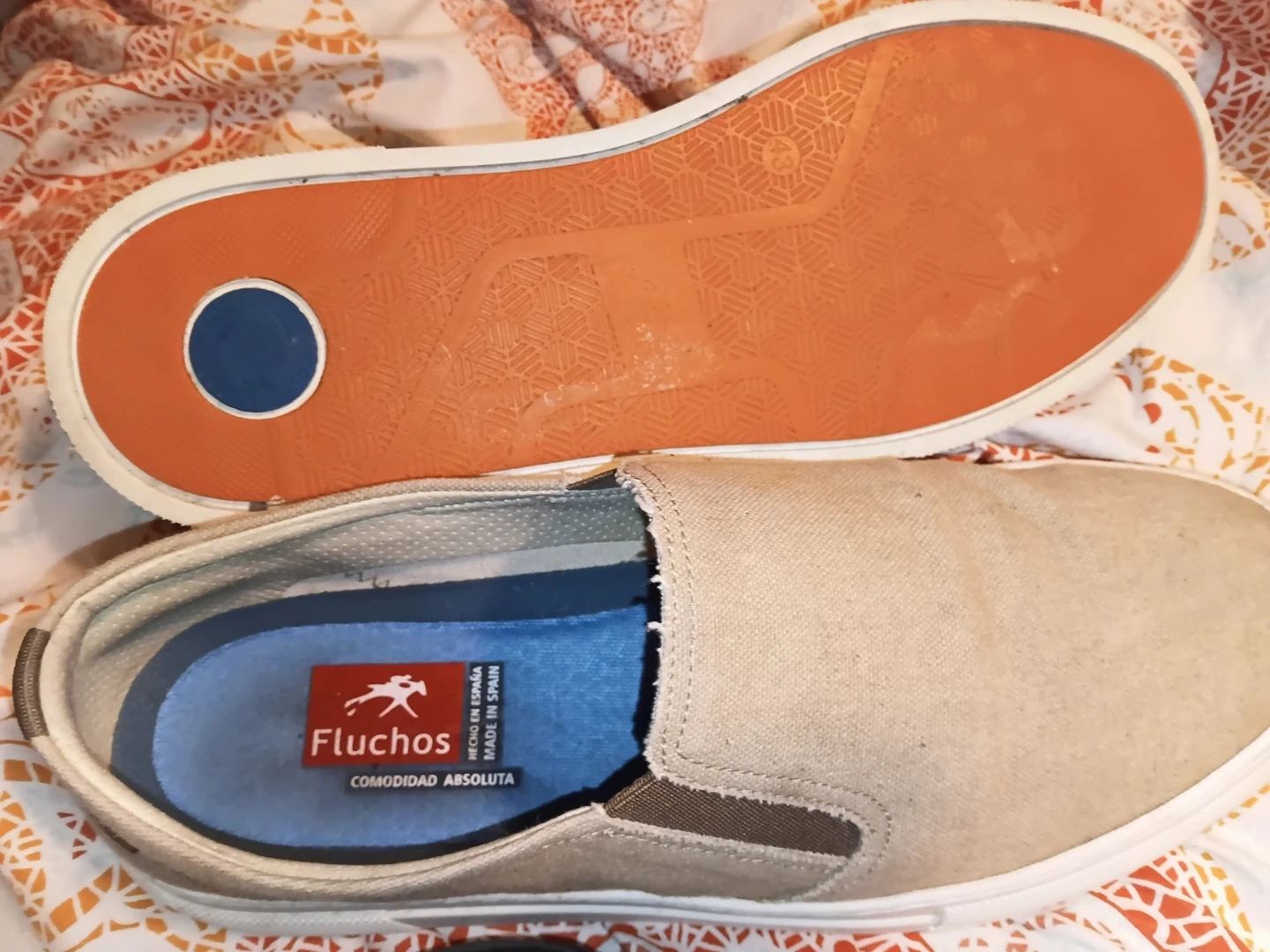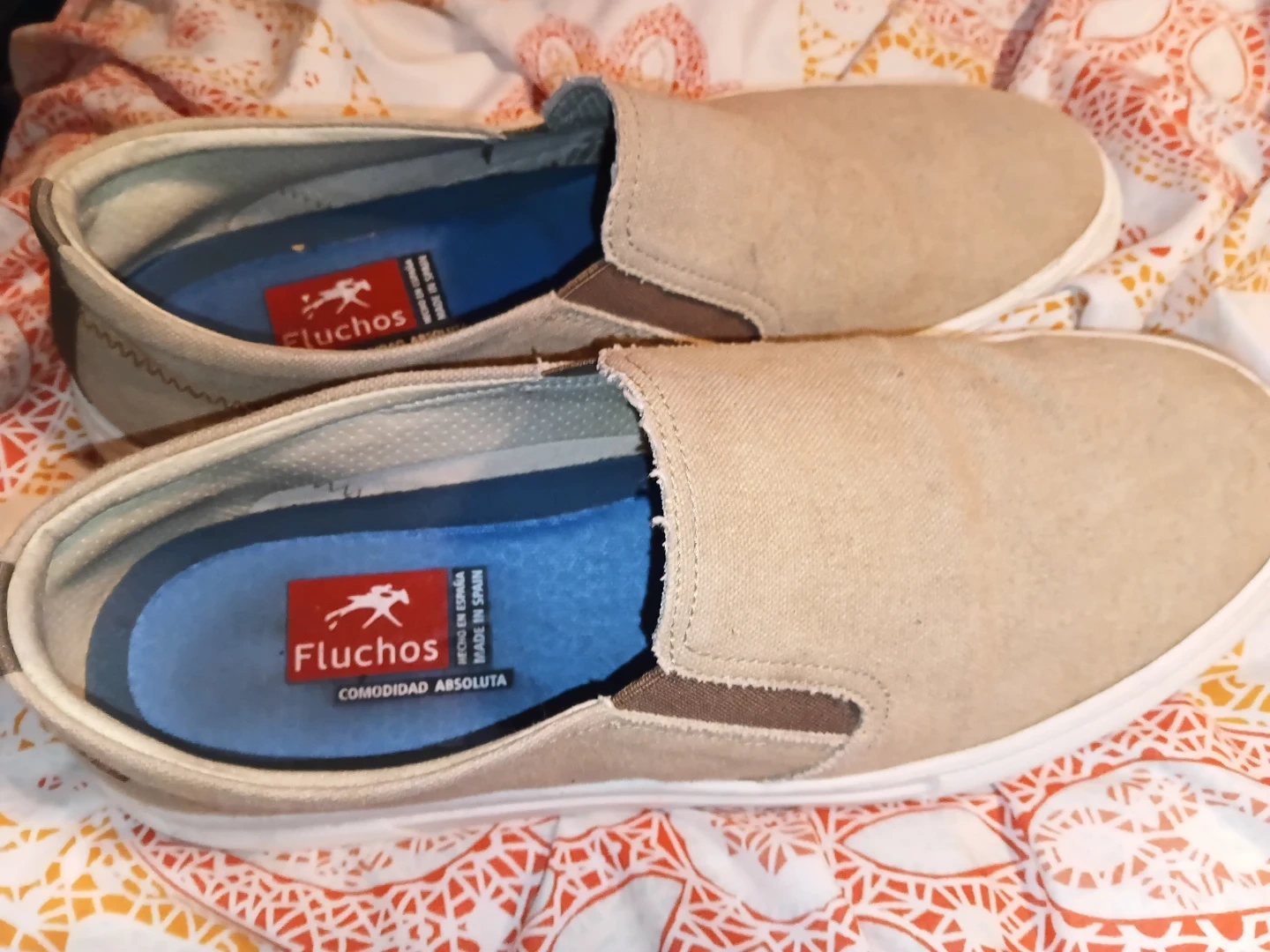 Comfortable Fluchos slip-on shoes in a tan canvas material. Made in Spain with a cushioned insole. Easy to wear for everyday casual outings.