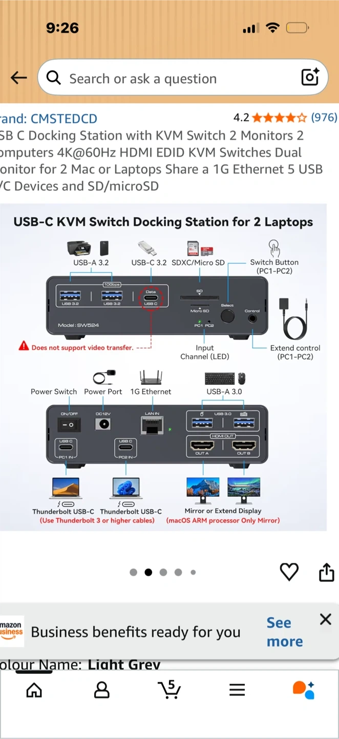This CMSTEDCD docking station has a KVM switch for 2 computers and supports 2 monitors at 4K@60Hz. It shares 1 monitor, 1G Ethernet, and 5 USB A/C devices. Includes SD/microSD card readers and USB 3.0/3.2 ports.
