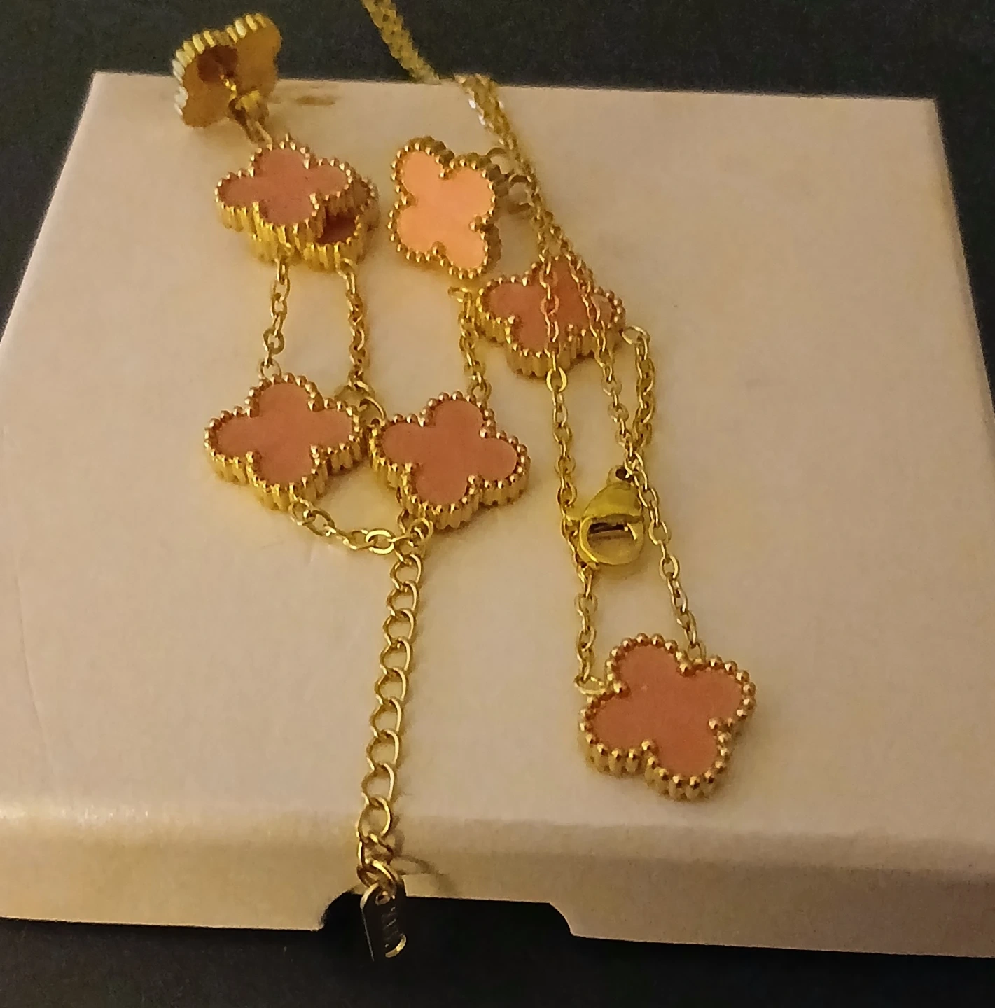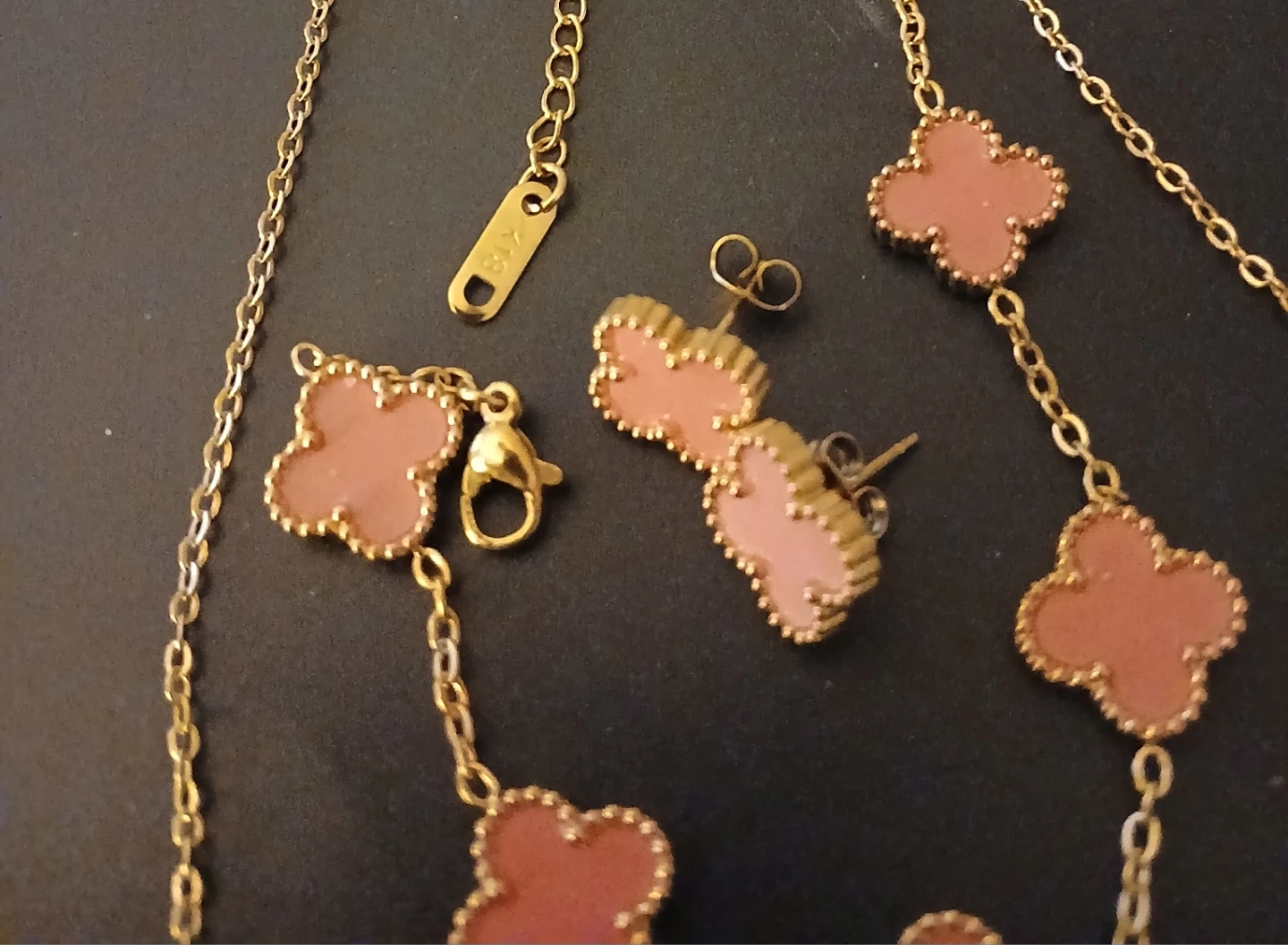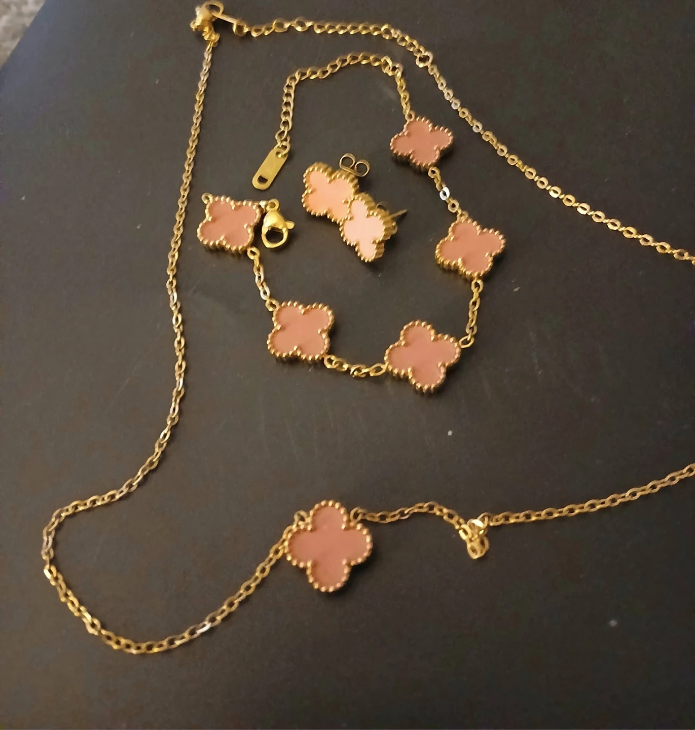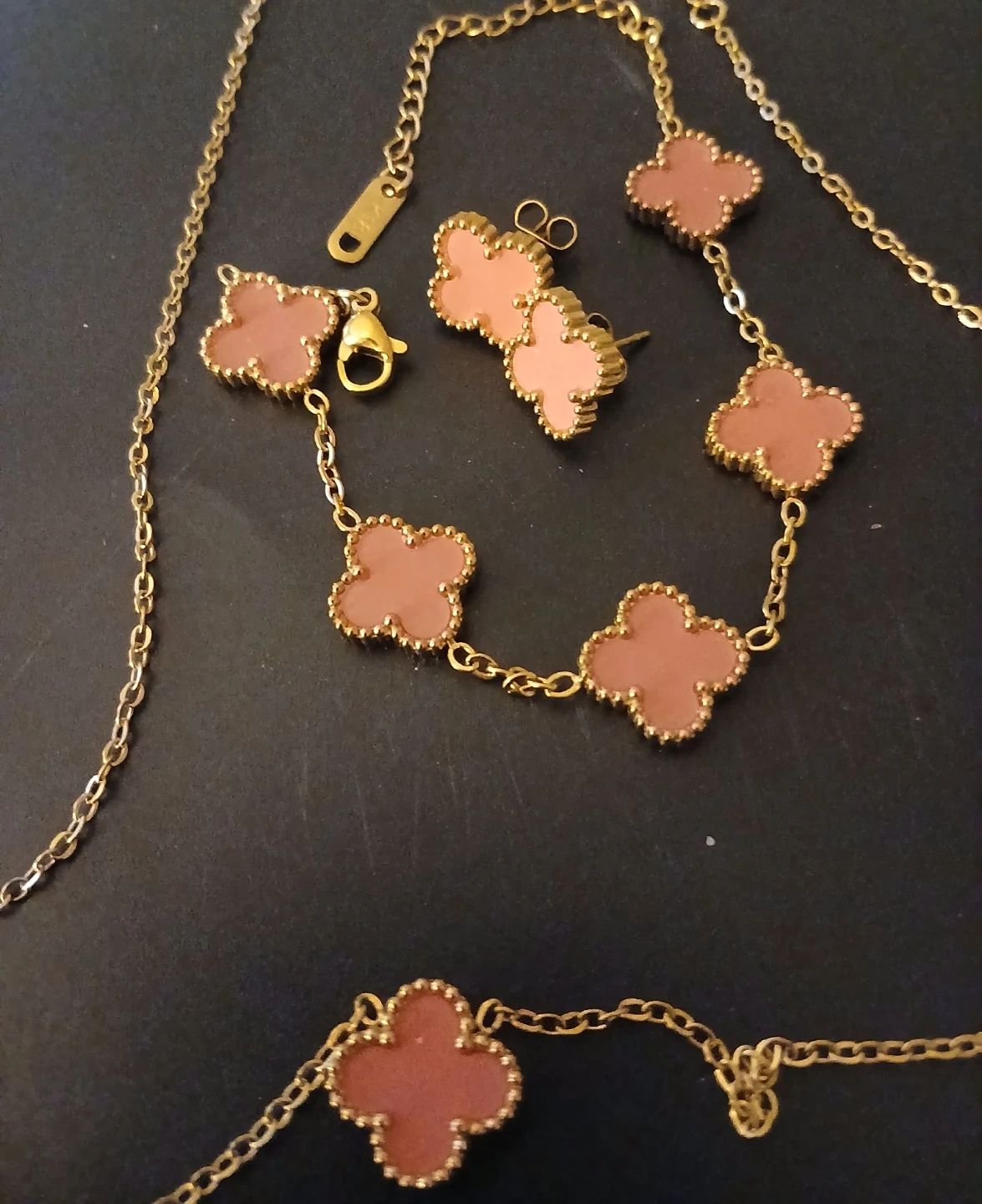 Stylish gold-tone necklace and matching stud earrings set. Features a delicate chain with clover-shaped charms in a blush pink hue. Plus bracelet