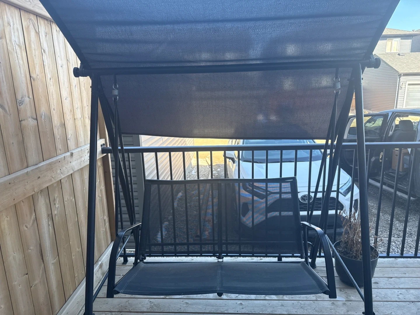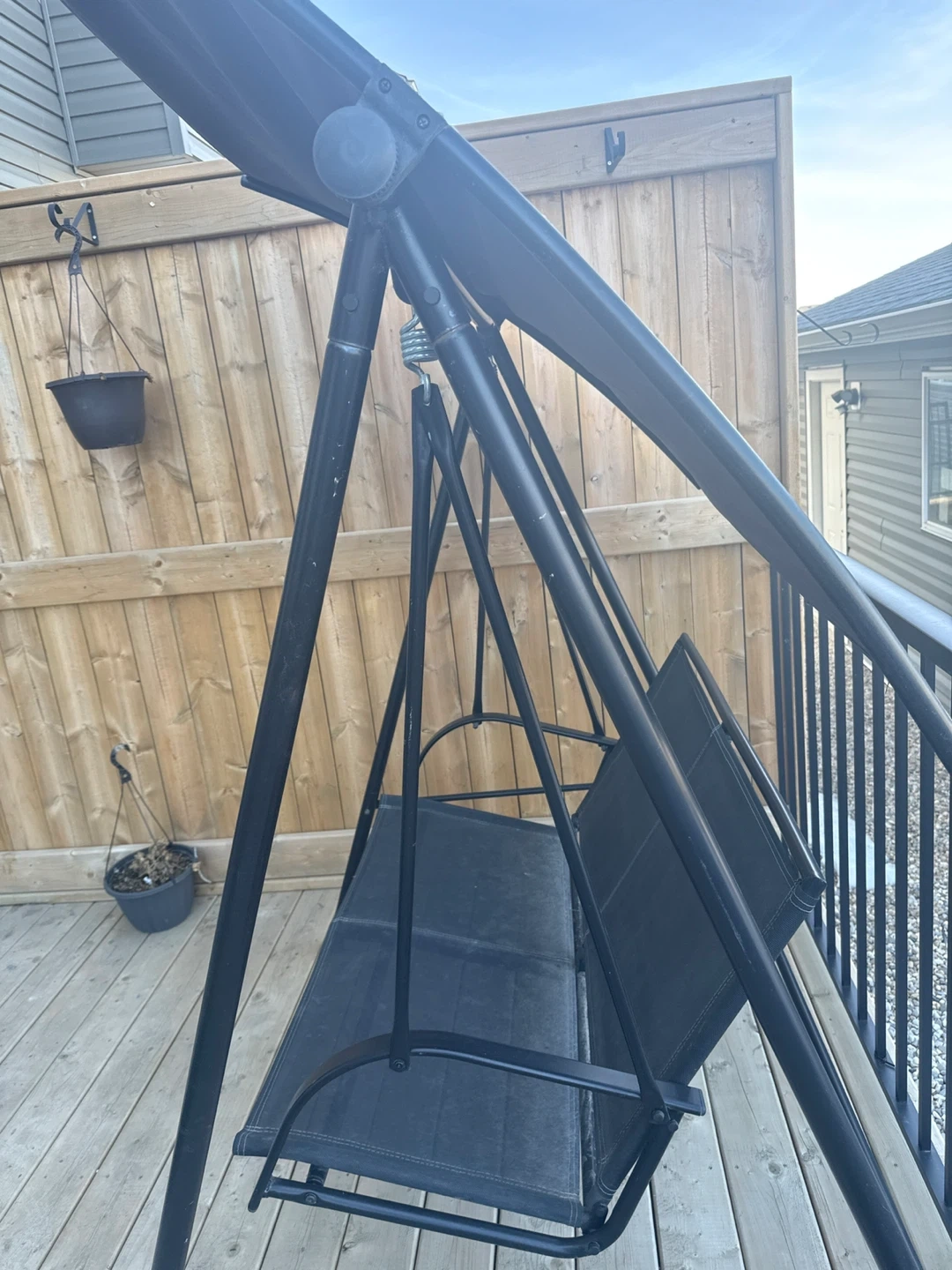 This is a two-seater patio swing chair with a canopy. It's made with a metal frame and fabric seating. Great for relaxing on your porch or in your yard!