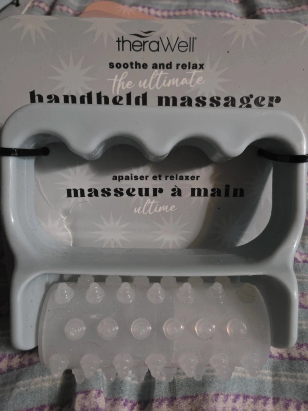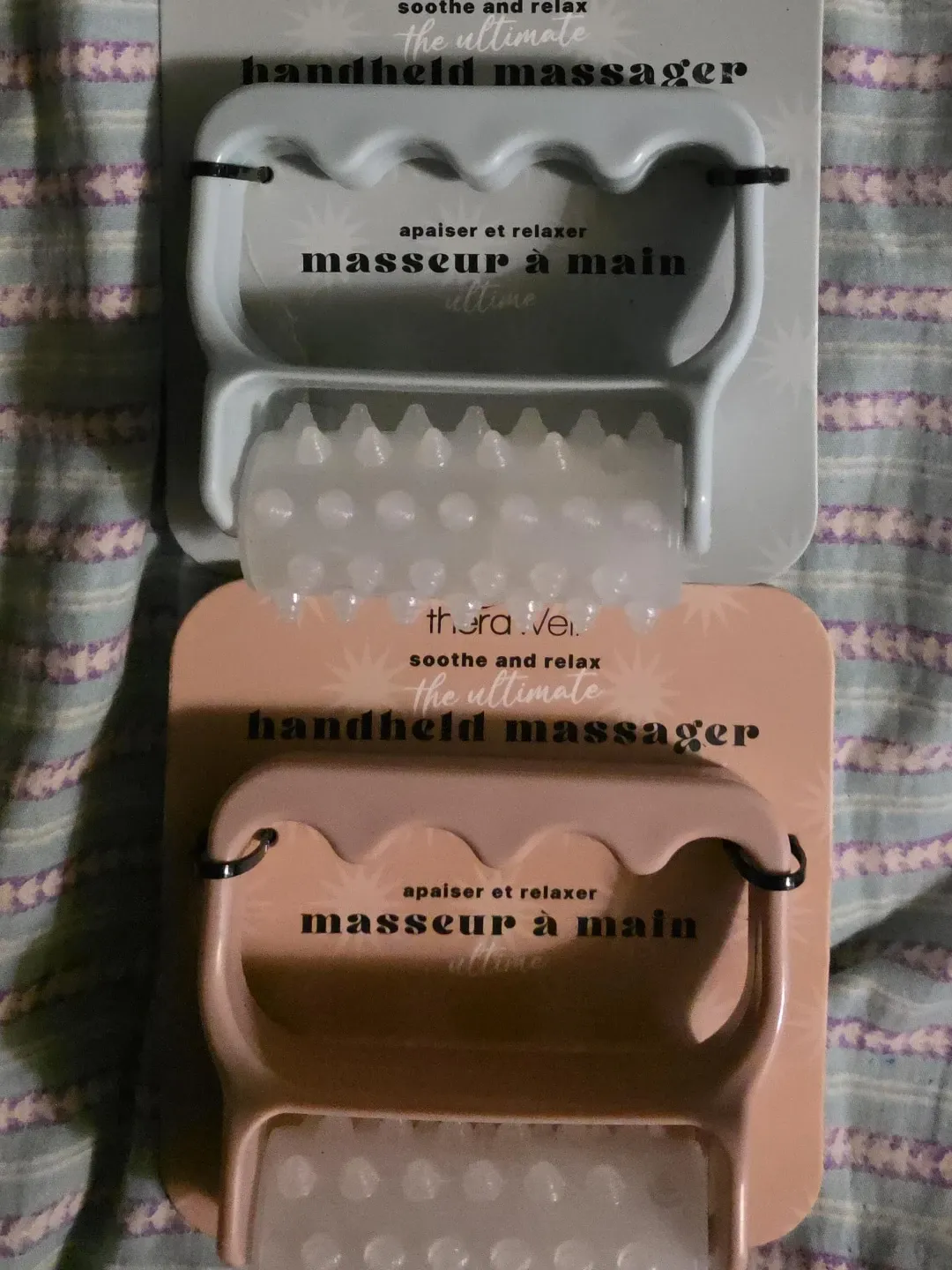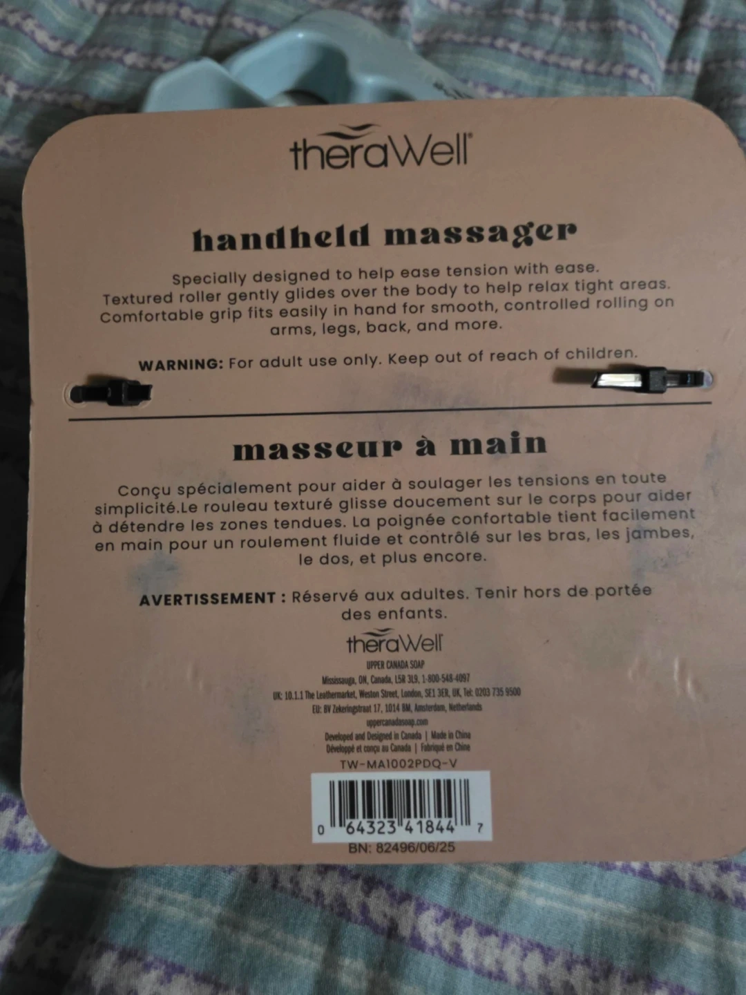 This TheraWell handheld massager is designed to help ease tension. It features a textured roller for smooth gliding and a comfortable grip for controlled rolling. Great for arms, legs, back, and more!