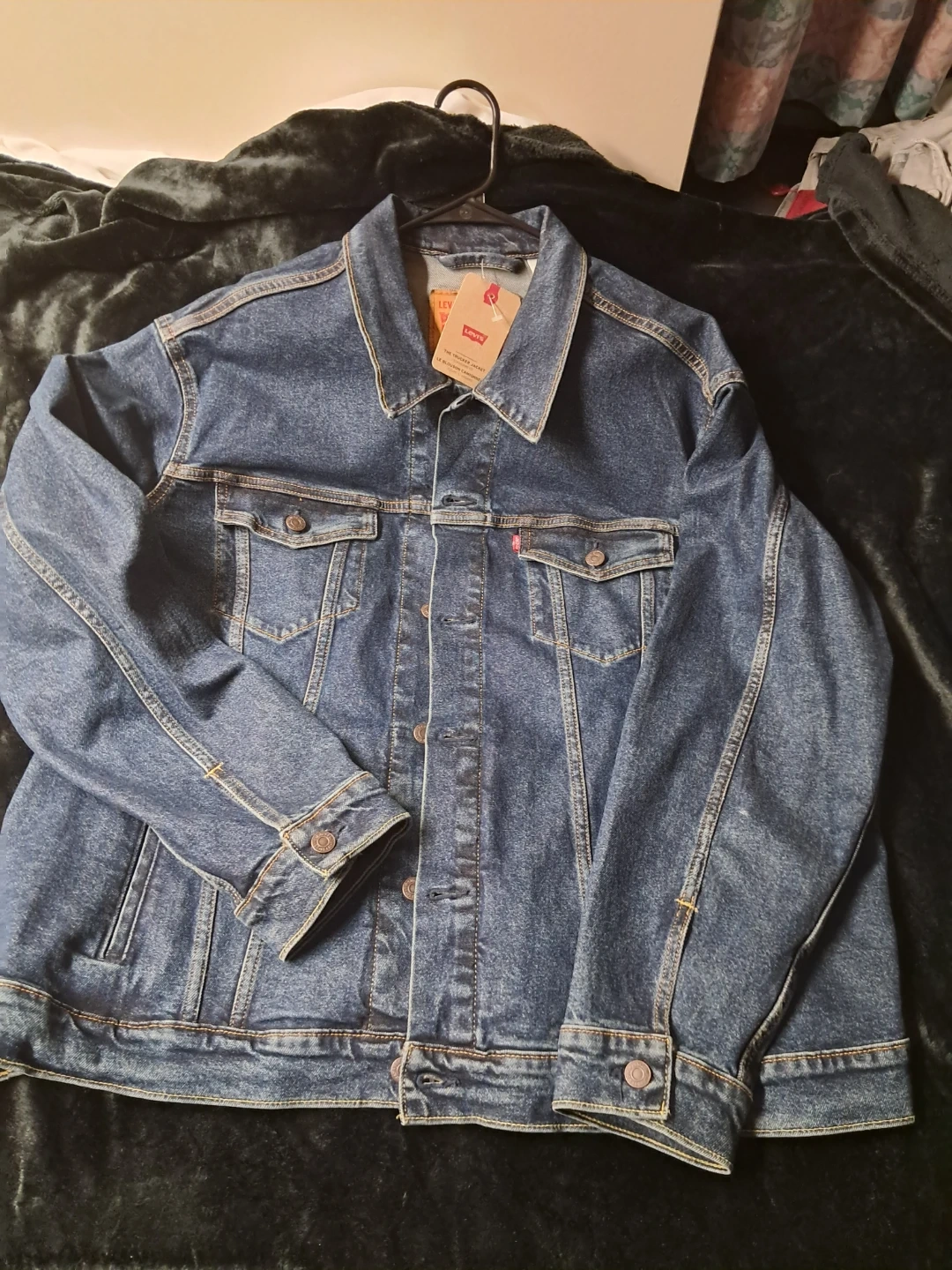 Classic Levi Strauss & Co. denim jacket in a dark wash. It's a size XXL/TIG. Made of durable denim material.