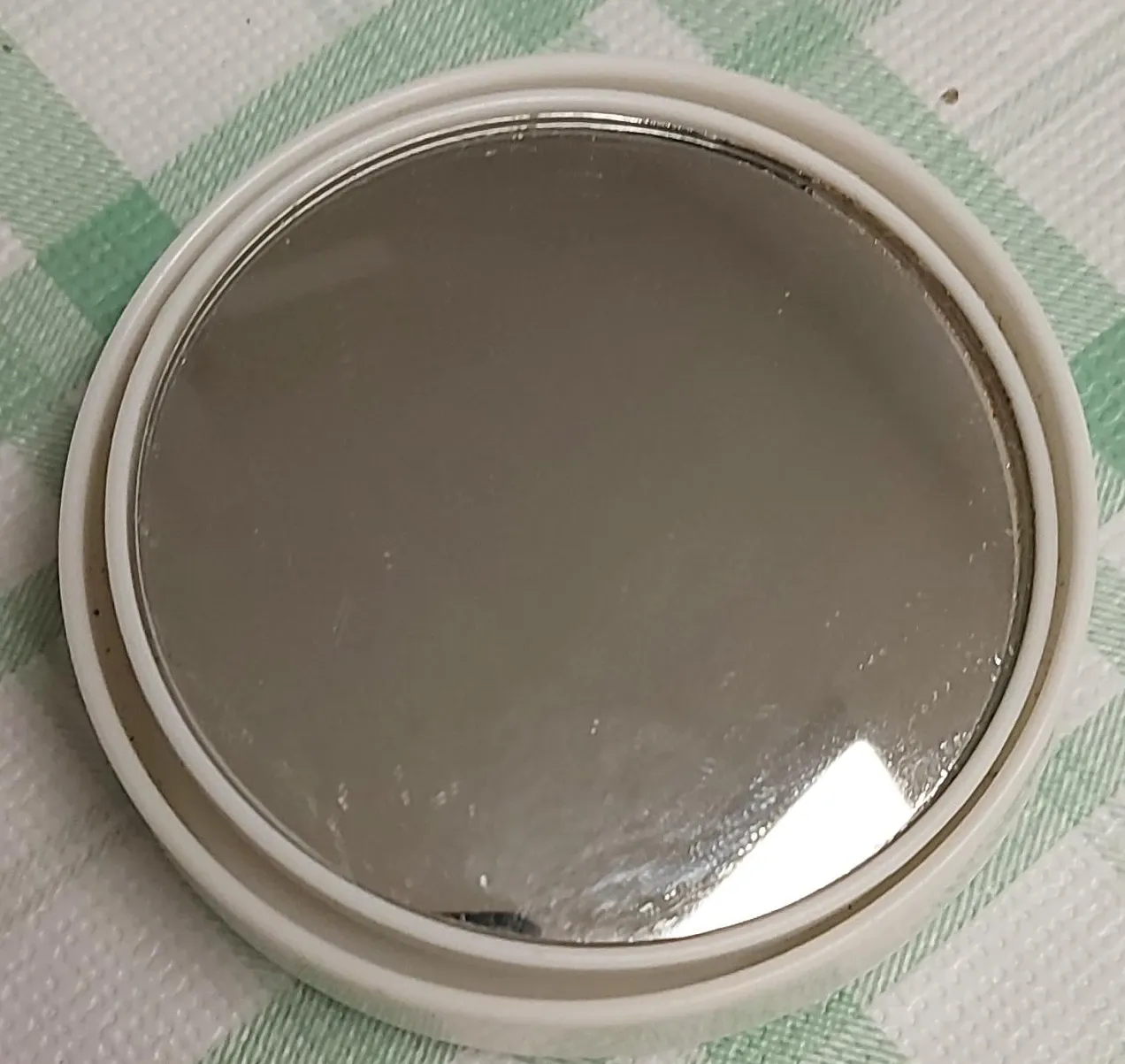 A simple white compact mirror. It's great for touch-ups on the go. Perfect for keeping in a purse or travel bag.