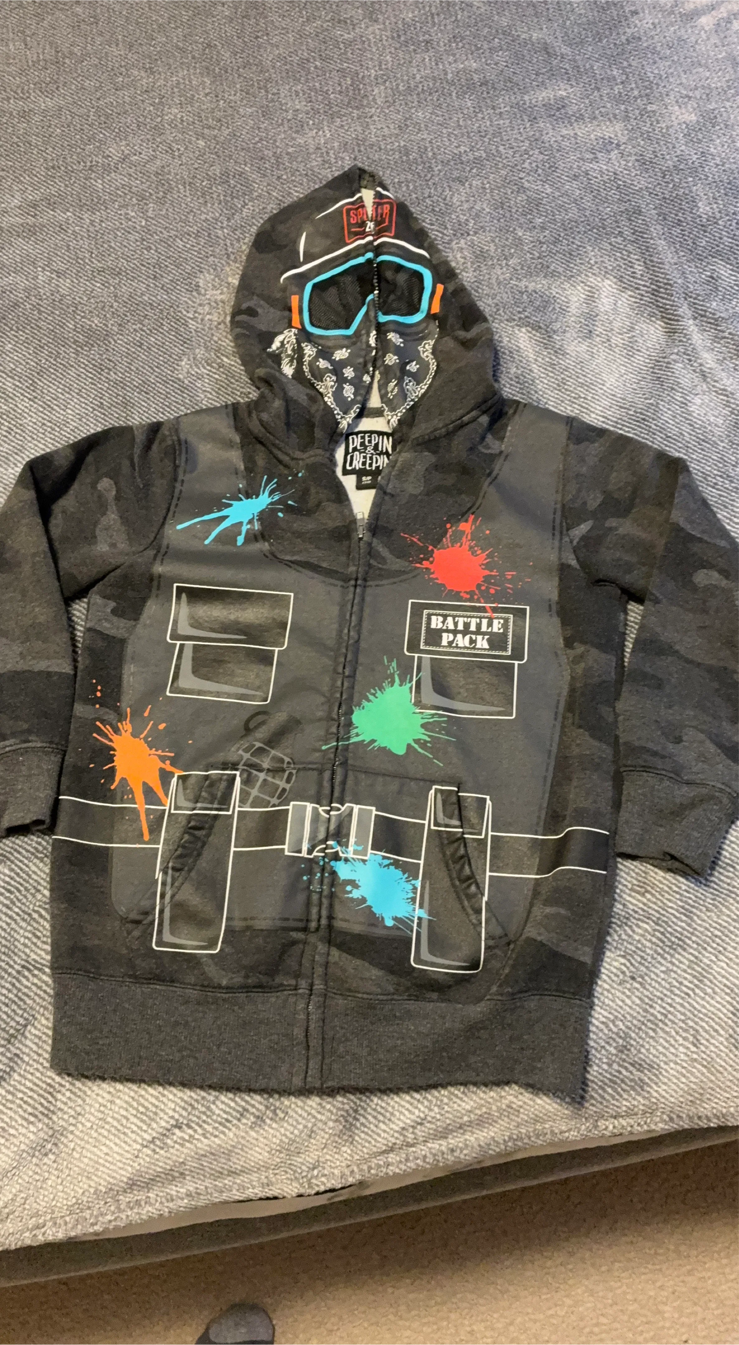 This kids zip-up hoodie features a camouflage pattern with colourful paint splatters. It has a 'Battle Pack' design on the front with graphic details. Material is a comfortable cotton blend. Size S/7/8 boys