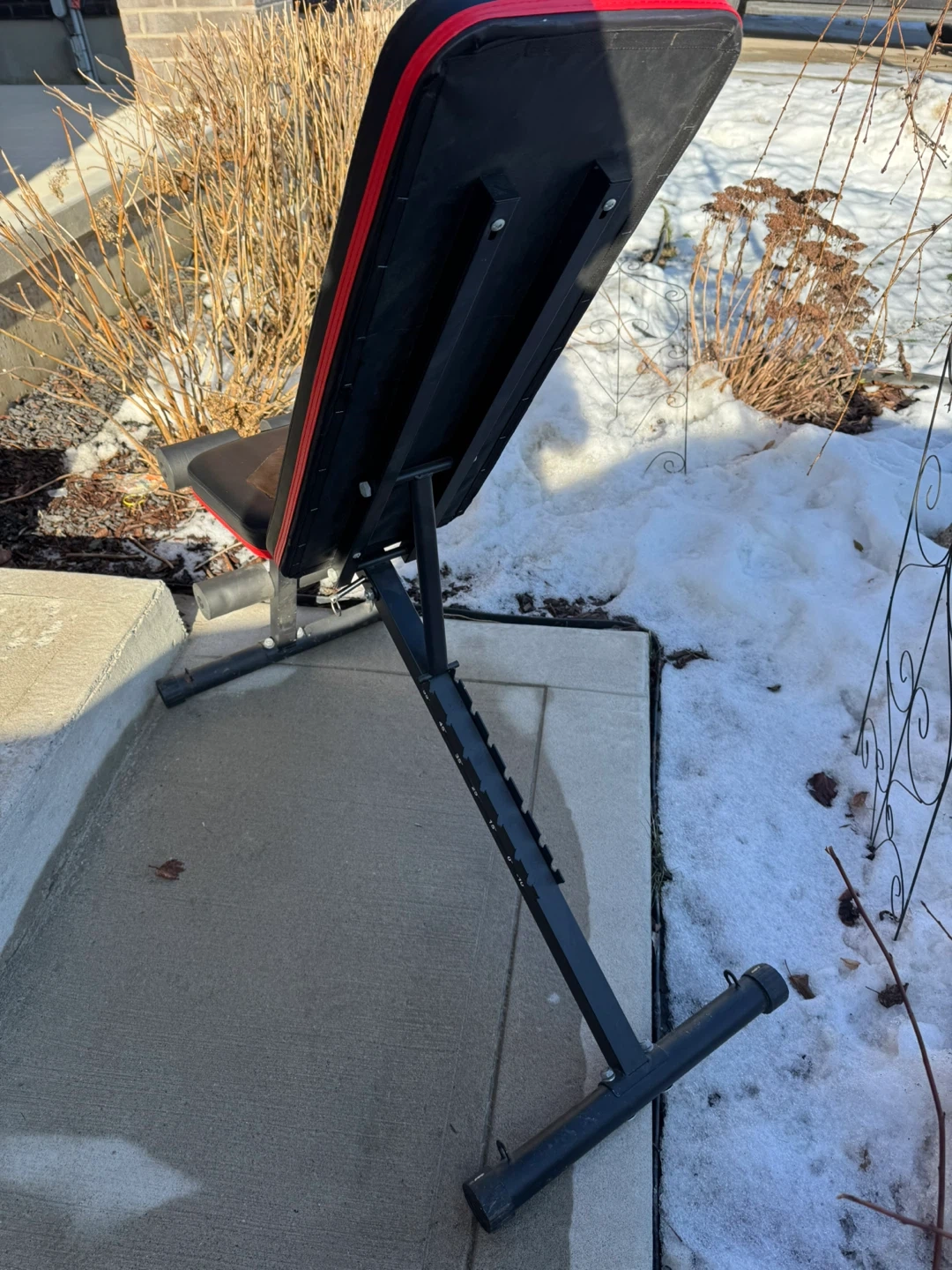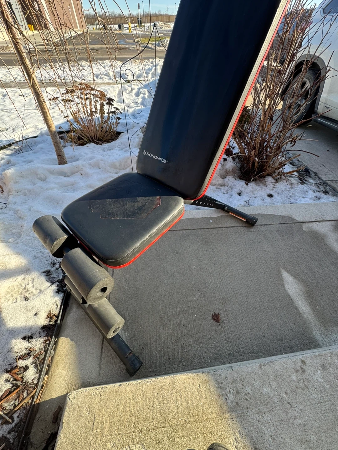This SONGMICS adjustable weight bench is great for home workouts. It's built with a sturdy frame and comfortable padding. Bench is black with red trim.
